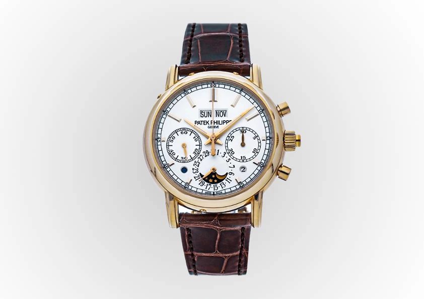 This Patek Philippe has a 18k rose gold Calatrava Cross deployant buckle and a transparent case back. Its function include: Chronograph, Date, Day, Month, Moon Phase, Perpetual Calendar and a Split Second Chronograph.