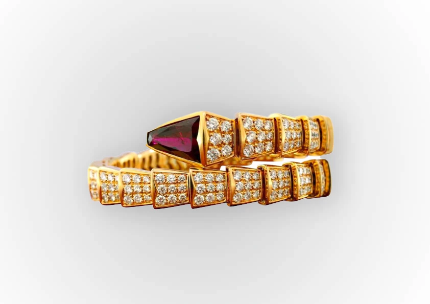 This gorgeous piece of jewelry is handcrafted in the finest 750 rose gold and dazzles with its form and layout. A total of 239 excellent-quality brilliant-cut Top Wesselton diamonds are used in this high-end piece of jewelry. With every movement, the 8.56 carats worth of gorgeously bright white diamonds that cover the entire piece of jewelry ignite an incredible display of brilliance that is difficult to put into words. A gorgeously dazzling rubellite serves as the representation of the viper's head and combines beautifully with the set diamonds.