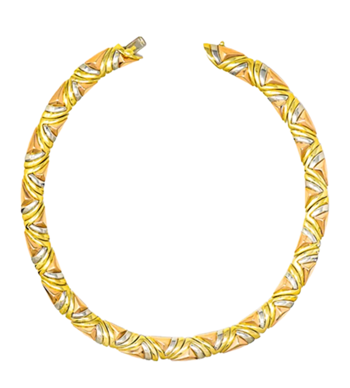 Introducing the exquisite FRENCH 1980'S 18 KARAT TRI-GOLD GEOMETRIC VINTAGE COLLAR NECKLACE, a true testament to timeless elegance and sophistication. This meticulously crafted collar necklace is a harmonious blend of fitted forms in tri-gold, designed to captivate and enchant.