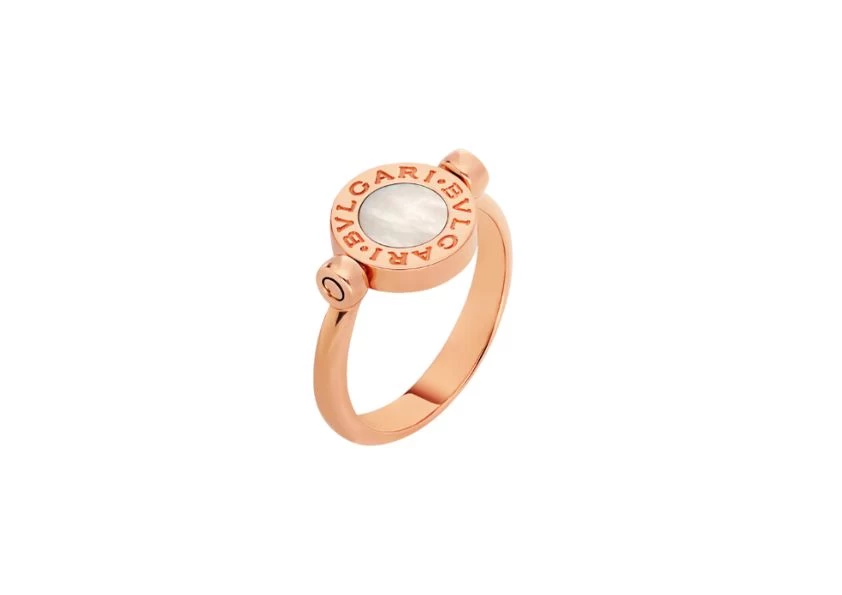 Inspired by the curved inscriptions found on ancient coins, the iconic double logo of BVLGARI BVLGARI has evolved into a playful interpretation, showcasing the brand's innovative spirit. Adorned with stunning mother-of-pearl and carnelian elements, this ring exudes a vibrant and effervescent charm.