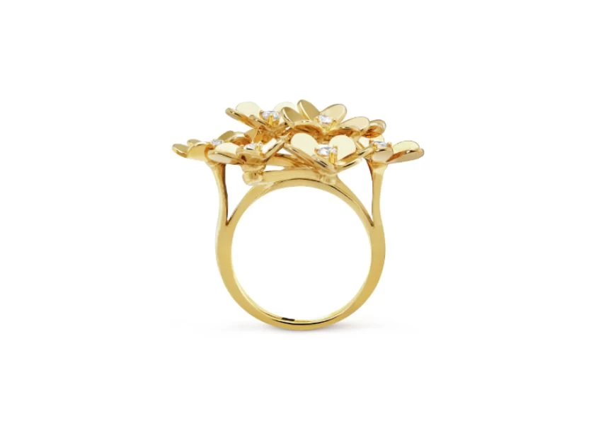 Introducing the exquisite Preloved: Frivole Ring, a true masterpiece from the renowned Van Cleef & Arpels collection. Crafted with utmost precision and attention to detail, this stunning ring features a delicate arrangement of 8 flowers, all meticulously crafted from 18K yellow gold. Each flower is adorned with a mesmerizing round diamond, boasting exceptional quality with a DEF color grade and an impressive clarity ranging from IF to VVS. The Preloved: Frivole Ring is a small model that effortlessly captures the essence of elegance and sophistication. Its petite size adds a touch of delicacy to the overall design, making it a perfect accessory for both everyday wear and special occasions. The round diamonds, totaling 0.43 carats, beautifully enhance the ring's allure, reflecting light with unmatched brilliance and sparkle. With their DEF color grade, these diamonds exhibit a pure and colorless nature, ensuring a captivating display of radiance. Crafted with the utmost care and precision, this Preloved: Frivole Ring is a testament to Van Cleef & Arpels' commitment to exceptional craftsmanship and timeless beauty. Embrace the allure of this remarkable piece and let it become a cherished addition to your jewelry collection. Please note that this particular ring is identified by the reference number VCARB67700, ensuring its authenticity and origin. Elevate your style with the Preloved: Frivole Ring and experience the epitome of luxury and sophistication.