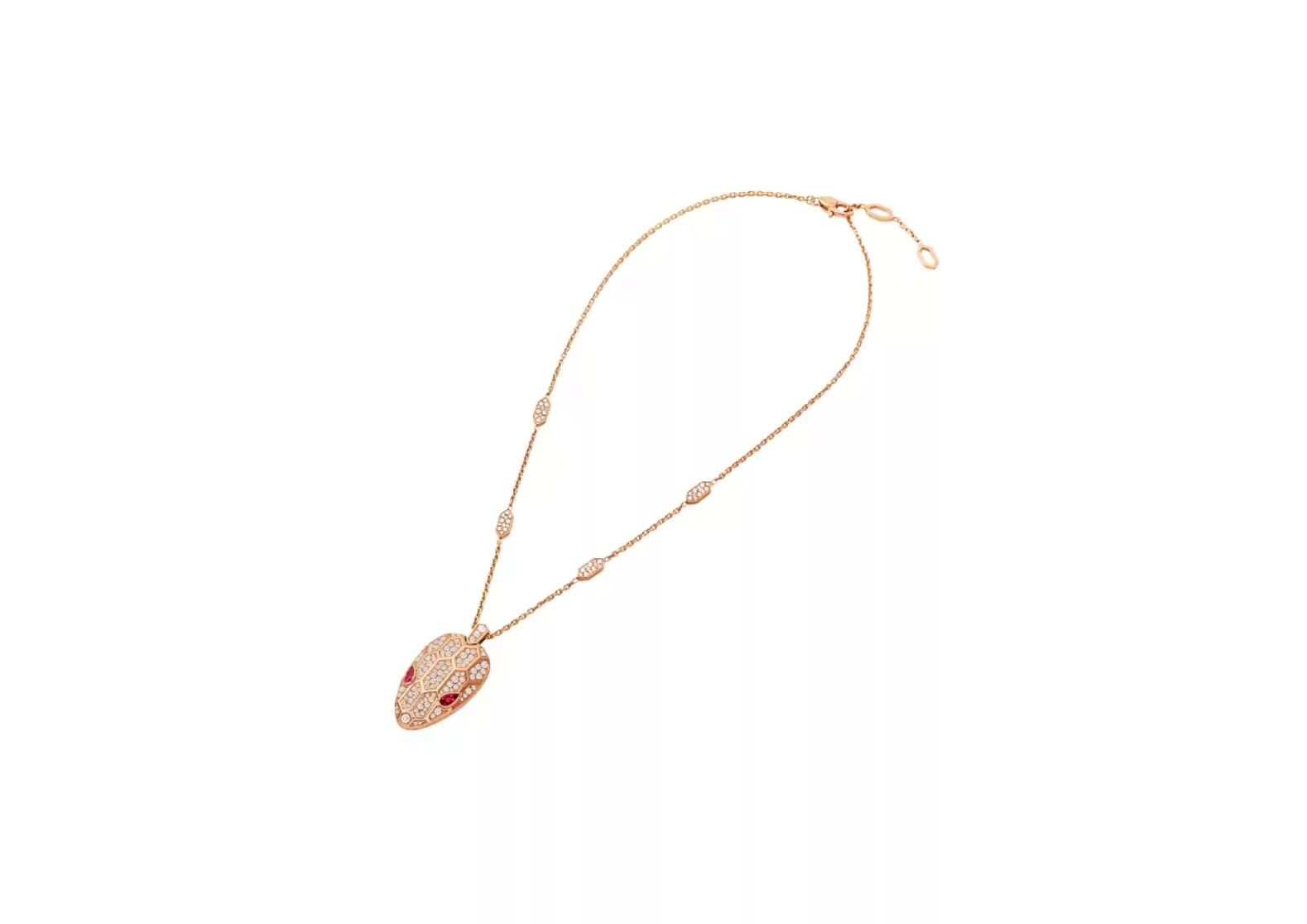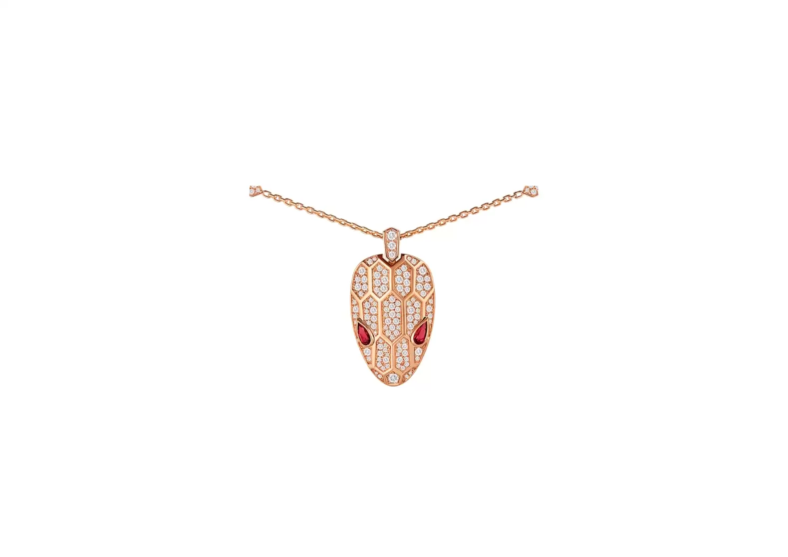 Introducing the exquisite Serpenti necklace in 18 kt rosegold, a true masterpiece that will leave you spellbound. This enchanting piece is meticulously crafted to capture the essence of allure and elegance. With its mesmerizing design, the Serpenti necklace showcases the head of the snake adorned with captivating rubellite eyes that exude a vibrant, fiery glow. The intricate detailing and meticulous craftsmanship bring this majestic creature to life, making it a symbol of power and grace. But that's not all – the chain and the head of the necklace are embellished with a dazzling pavé of diamonds, adding a touch of opulence and brilliance. Each diamond sparkles with unparalleled radiance, reflecting the light with every movement, truly mesmerizing anyone who beholds it. Inspired by the irresistible charm of a woman's gaze, Bulgari has reimagined its iconic spirit animal, the snake, in a way that captivates and seduces. The Serpenti necklace embodies the magnetic power of the eyes, symbolizing the ability to enthrall and enchant. Indulge in the allure of this Serpenti necklace, a testament to Bulgari's dedication to creating timeless and extraordinary pieces of jewelry. Whether worn for a special occasion or as a statement piece, this necklace is sure to make a lasting impression, leaving admirers in awe of its beauty and sophistication. Experience the allure and sophistication of the Serpenti necklace – a true masterpiece that embodies the power of attraction.
