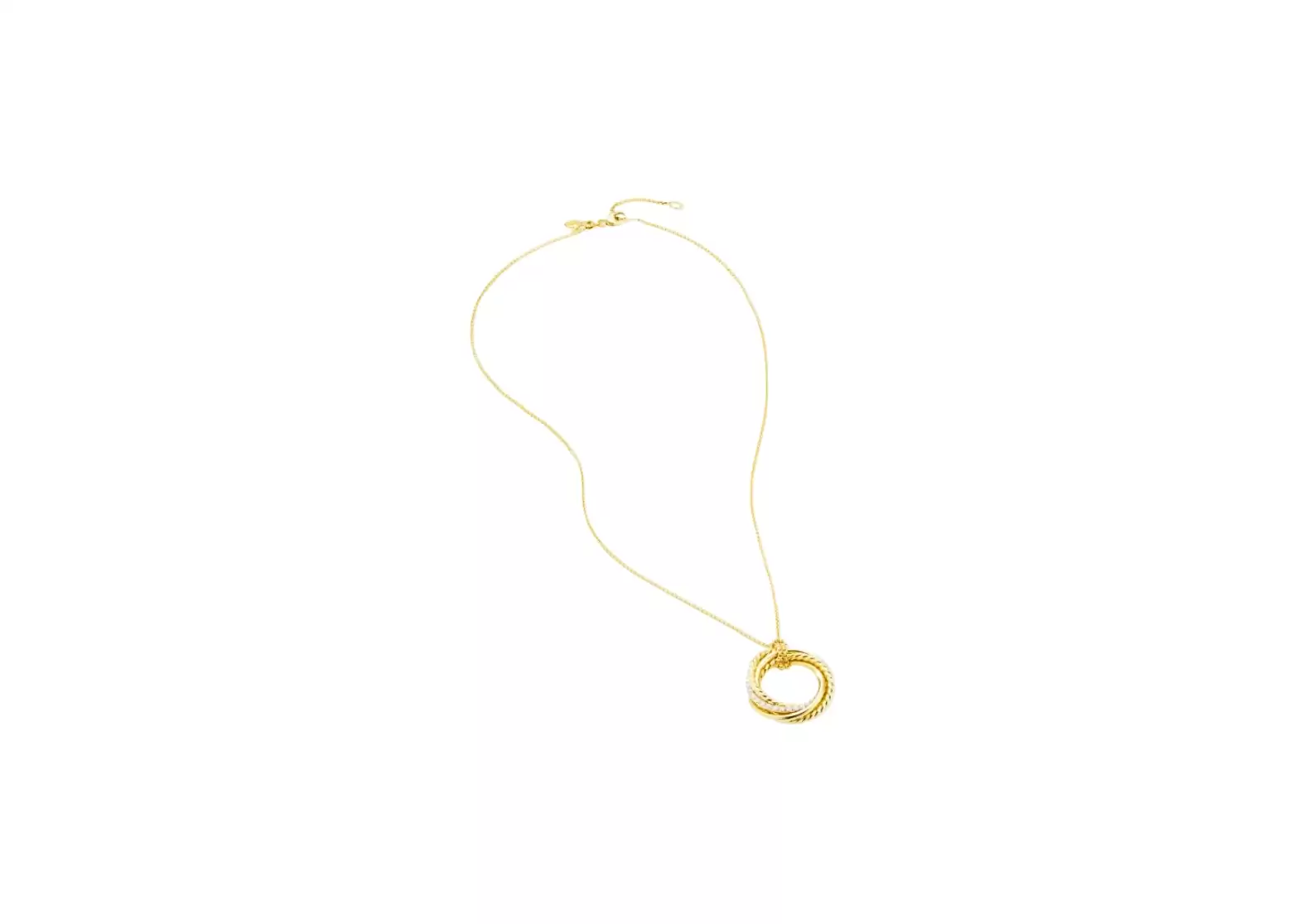 Introducing the exquisite Preloved: Crossover Pendant Necklace in 18K Yellow Gold with Diamonds. Crafted with utmost precision and attention to detail, this stunning piece is a true testament to timeless elegance.