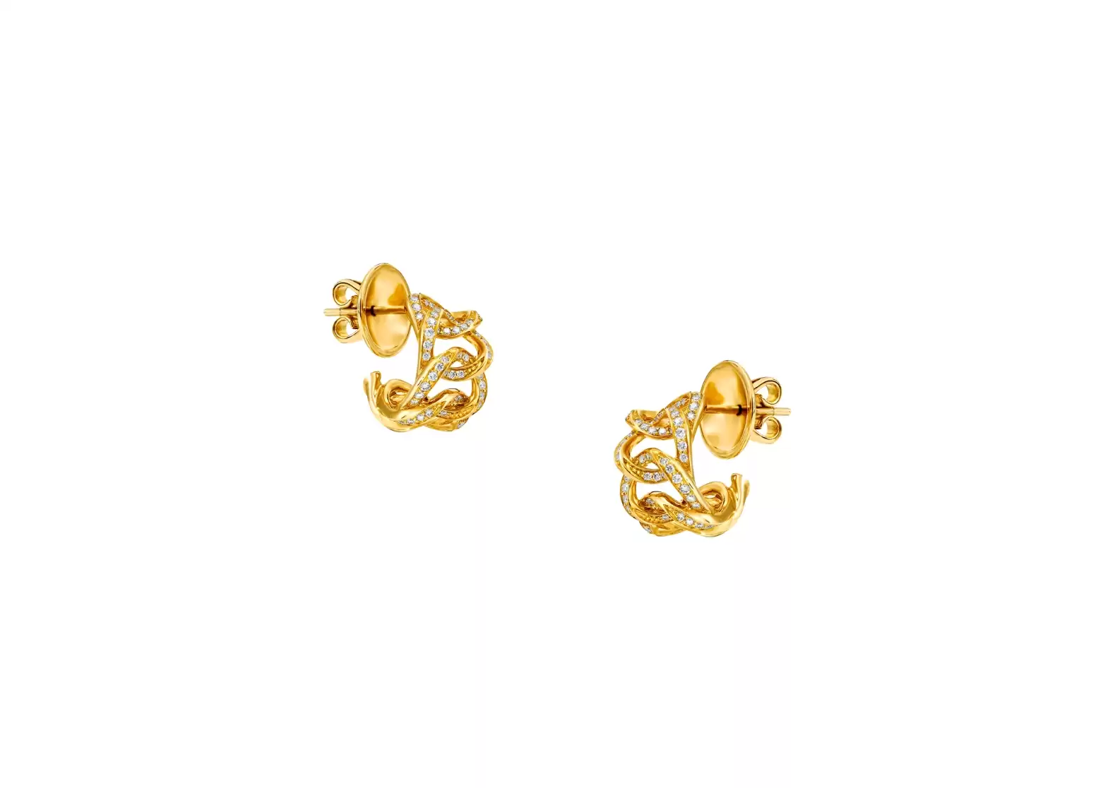 With a total weight of approximately 0.35 carats, these earrings are adorned with pavé diamonds that add a touch of glamour and brilliance to the design. The combination of the sculptural yellow gold and the sparkling diamonds creates a mesmerizing and eye-catching effect.