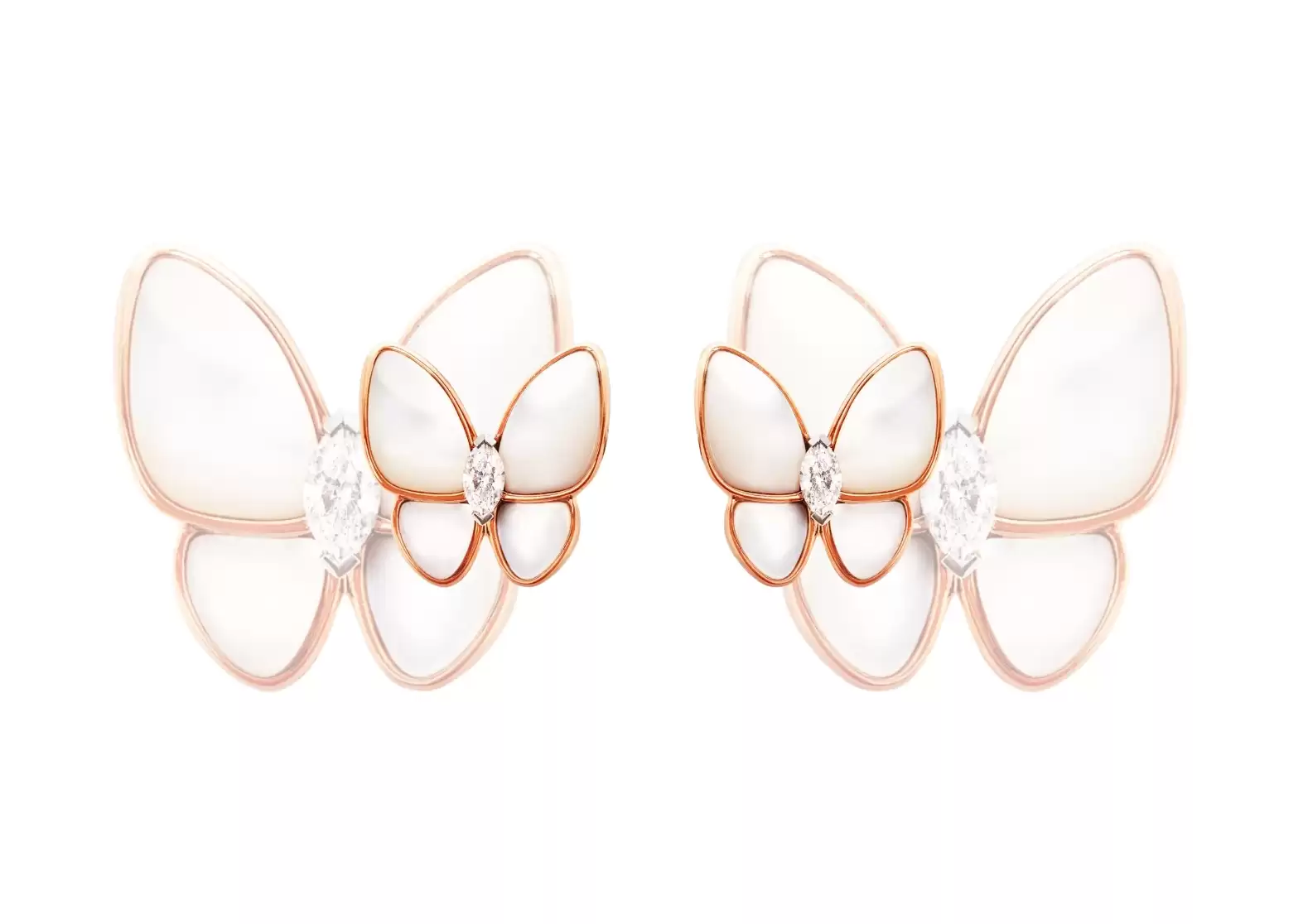 The Two Butterfly Earrings feature a total of 2 diamonds, weighing 0.31 carats. These dazzling stones are perfectly complemented by the 8 white mother-of-pearl stones, creating a harmonious blend of natural beauty.