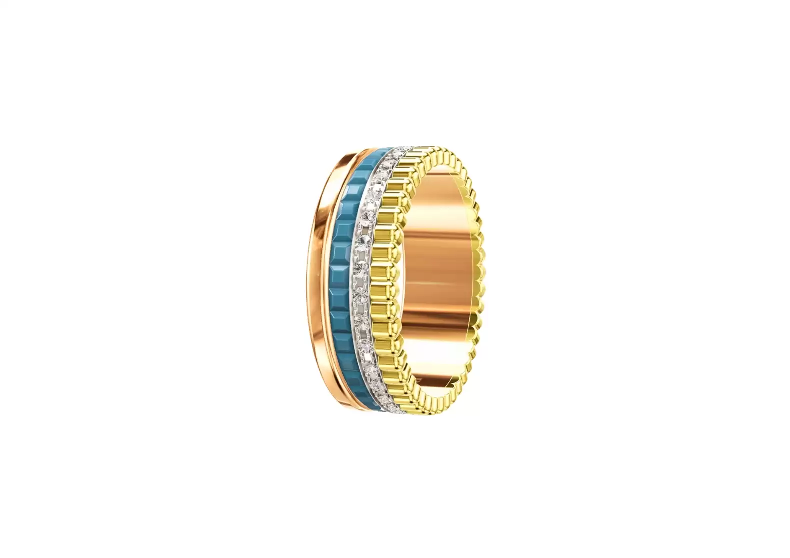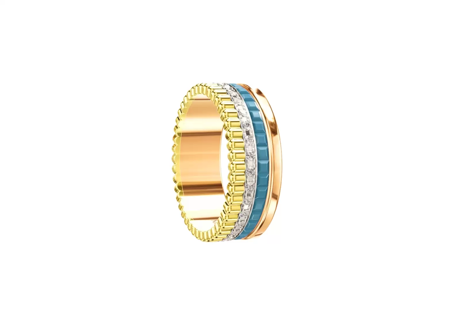 Introducing the exquisite Preloved: Quatre Blue Edition Small Ring REF JRG03028, a true masterpiece crafted with the finest materials and unparalleled attention to detail. This stunning ring is adorned with a remarkable 330.24-carat round diamonds, radiating a mesmerizing brilliance that will captivate all who lay eyes on it. Each diamond has been carefully selected for its exceptional quality, ensuring a truly luxurious and opulent piece. The band of this magnificent ring is expertly crafted from 18K yellow, pink, and white gold, adding a touch of sophistication and elegance. The combination of these three gold hues creates a harmonious and visually striking contrast, making this ring truly unique. Adding a contemporary twist to its design, the Preloved: Quatre Blue Edition Small Ring features a captivating blue ceramic element. This vibrant blue hue adds a pop of color and modern flair to the overall aesthetic, making it a perfect choice for those seeking a statement piece that stands out from the crowd. With its distinctive design and exceptional craftsmanship, this ring is a true testament to the artistry of fine jewelry. It effortlessly combines classic elegance with contemporary style, making it a versatile accessory that can be worn for any occasion. The Preloved: Quatre Blue Edition Small Ring REF JRG03028 is a true symbol of luxury and sophistication. Its timeless beauty and impeccable quality make it a treasured addition to any jewelry collection. Elevate your style and make a lasting impression with this extraordinary piece.