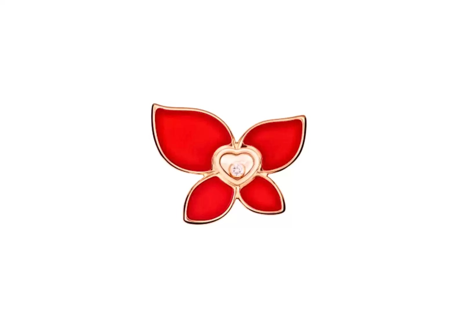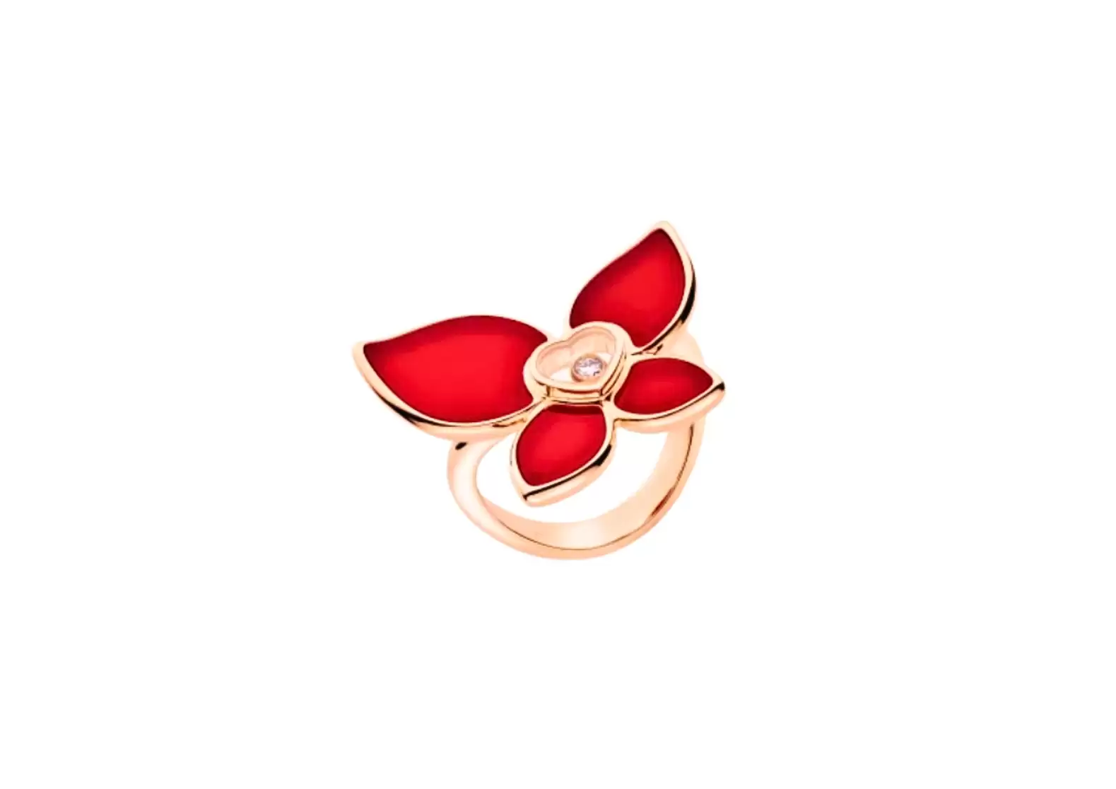 Introducing the exquisite Preloved: Happy Butterfly X Mariah Carey Ring, a true testament to the harmonious partnership between renowned music icon Mariah Carey and esteemed luxury brand Chopard. This ethereal piece of jewelry is delicately crafted, drawing inspiration from the graceful beauty of butterflies. Embracing the philosophy that "Little Diamonds Do Great Things," this ring showcases a stunning combination of ethically sourced diamonds, vibrant carnelian gemstones, and lustrous 18k rose gold. Each element has been thoughtfully chosen to create a mesmerizing ensemble that exudes elegance and sophistication. As a Chopard Boutique Exclusive, this ring is a rare treasure. With its unique REF. NUMBER: 828599-5010, it represents a limited edition piece that will make any jewelry collection truly exceptional. Indulge in the enchanting allure of the Preloved: Happy Butterfly X Mariah Carey Ring, and let its timeless beauty adorn your finger, adding a touch of grace and glamour to any occasion. Experience the magic of this collaboration and embrace the extraordinary craftsmanship that Chopard and Mariah Carey have brought to life.