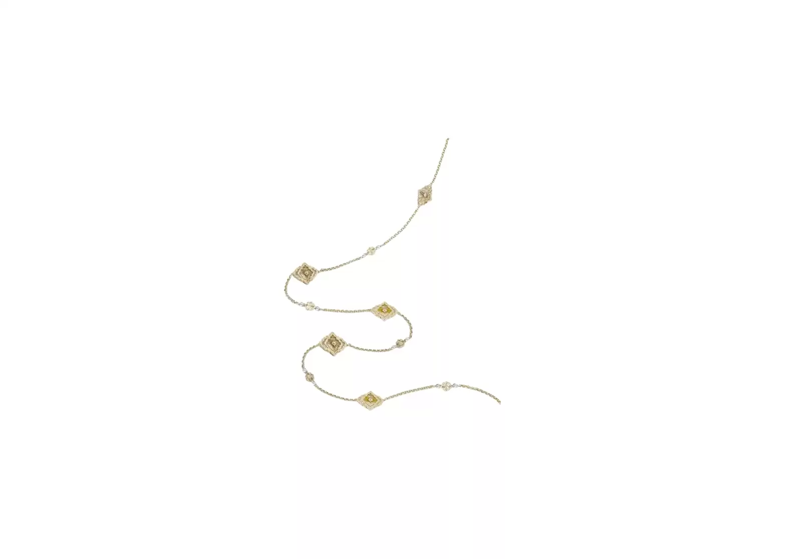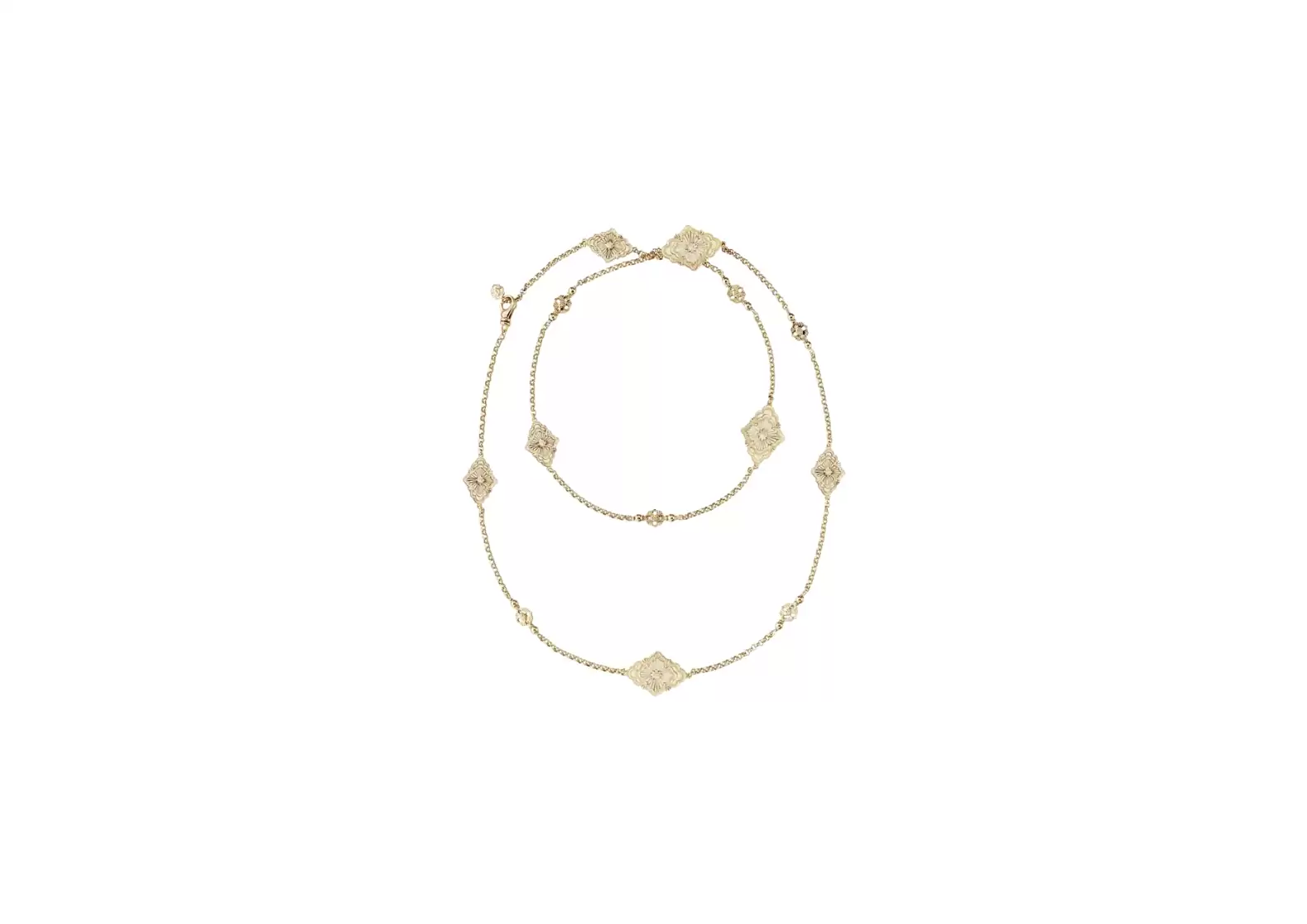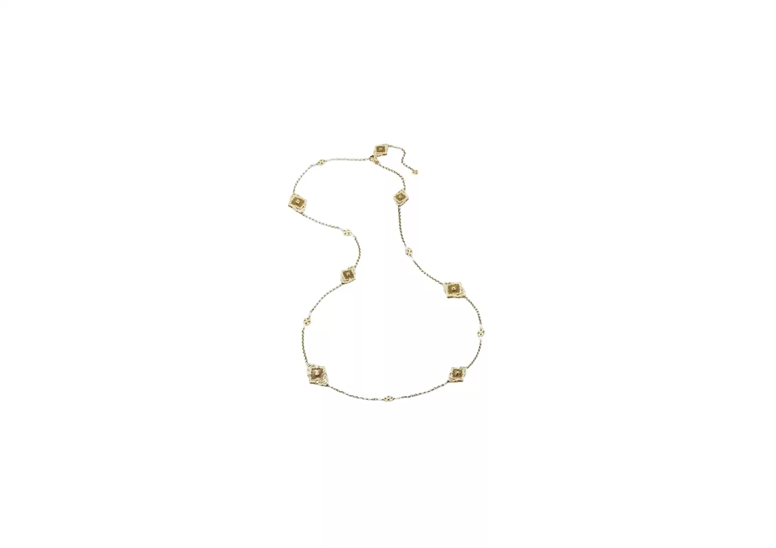 Introducing the exquisite Preloved Opera Tulle Necklace in yellow gold, adorned with a mesmerizing mother of pearl. This sautoir necklace is a true work of art, featuring seven double layered logo elements of varying dimensions, all crafted in luxurious yellow gold.