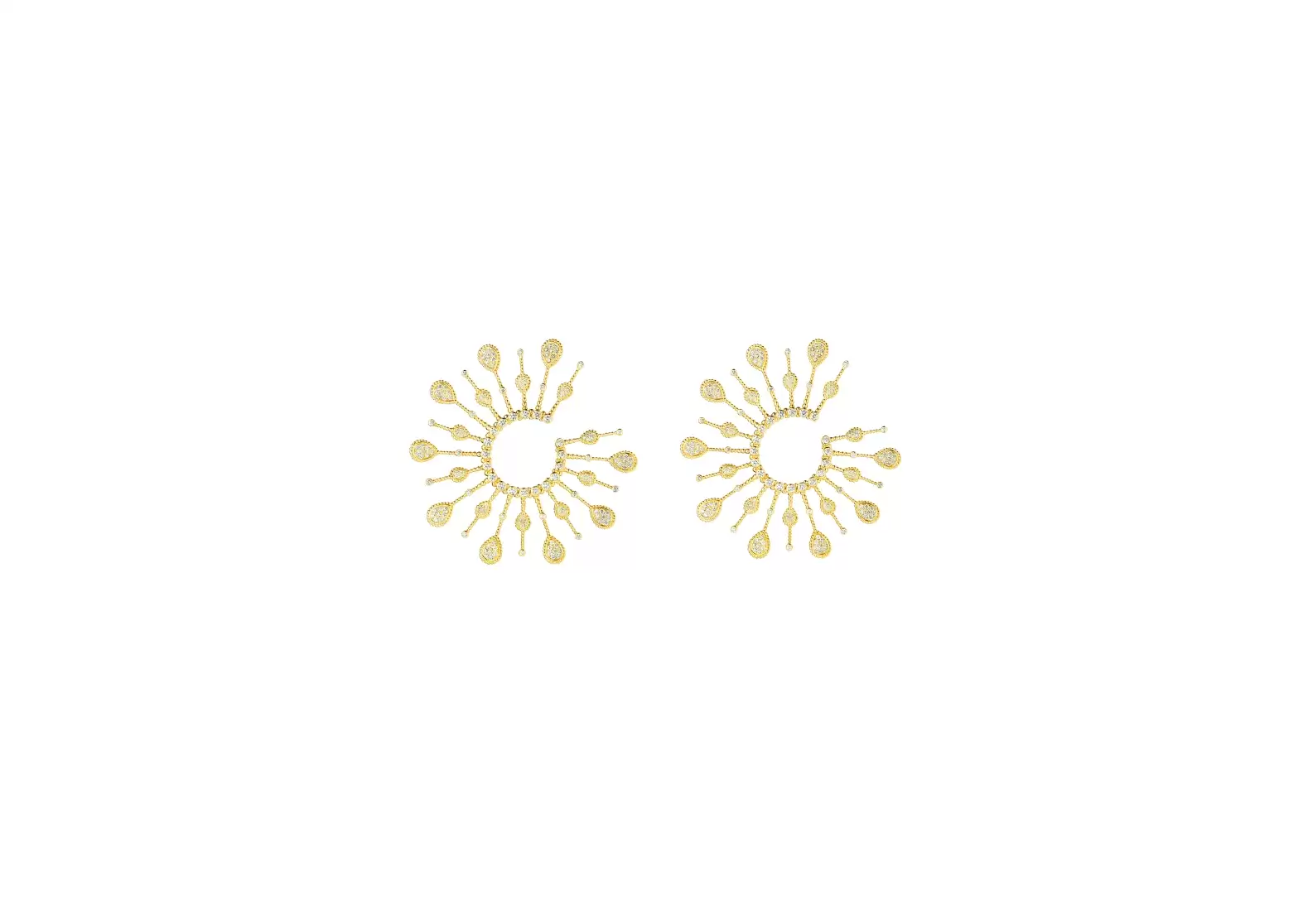 With an exterior diameter of 79.8 mm, these hoop earrings are designed to make a bold statement. The intricate design features 380 round diamonds, totaling an impressive 6.88 carats, meticulously set in 18K yellow gold. Each diamond sparkles brilliantly, adding a touch of glamour to any outfit.