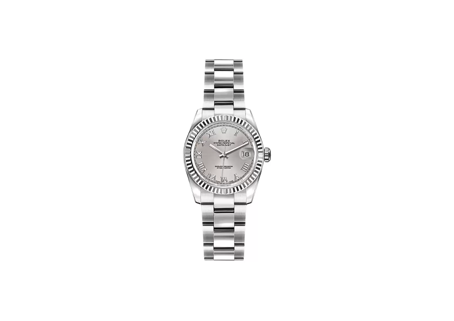 Crafted with meticulous attention to detail, this watch boasts a silver dial adorned with Roman numeral hour markers, adding a touch of sophistication to its overall design. The solid 18k white gold fluted bezel further enhances its allure, making it a statement piece that will surely turn heads.