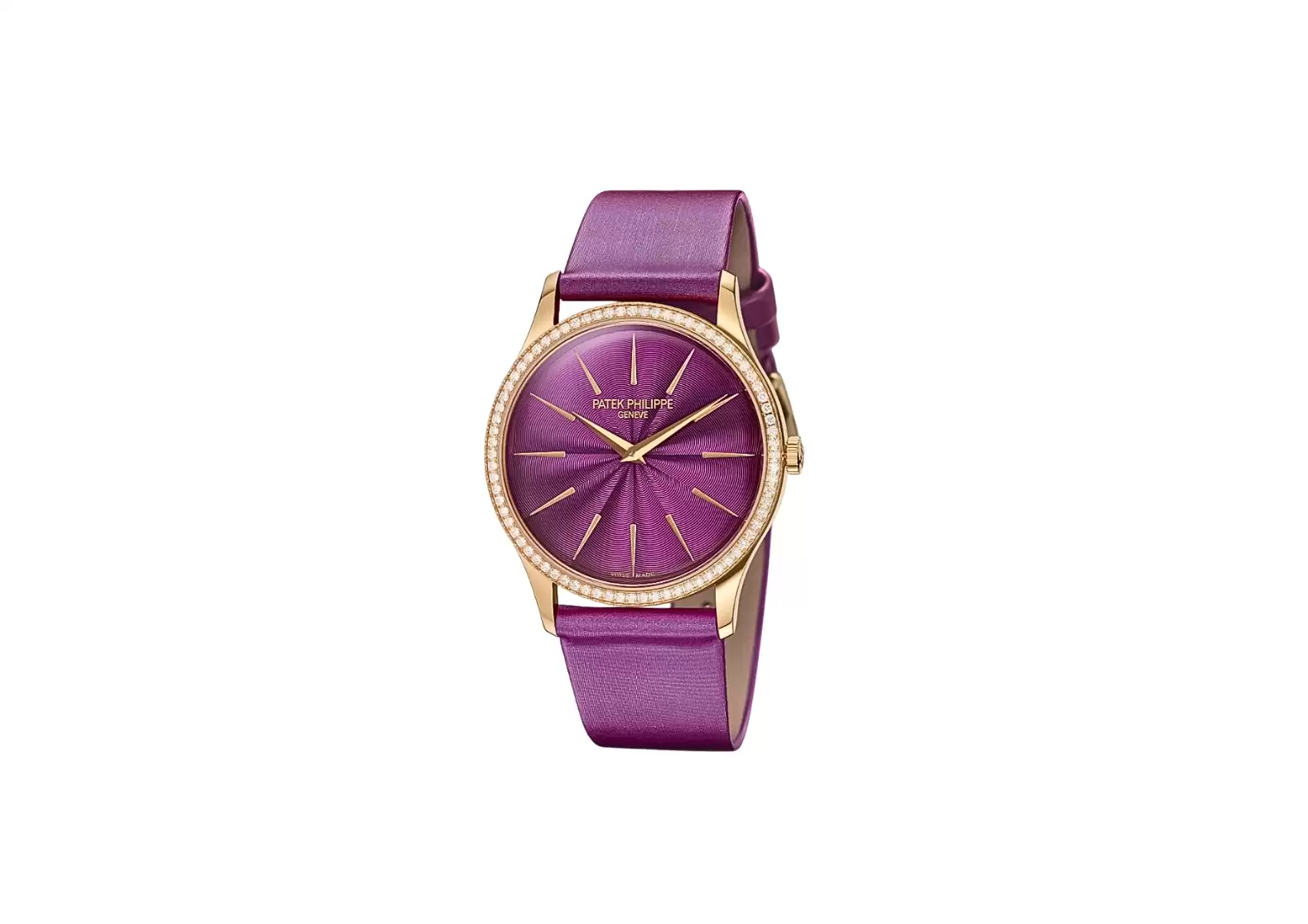 Introducing the Pre-owned Patek Philippe 4997/200R-001, a stunning addition to Patek Philippe's collection of elegant ladies' watches. This timepiece showcases a new version of the self-winding Calatrava Reference 4997, crafted in luxurious rose gold and adorned with a captivating purple hue. The unique color choice harmoniously complements the warm tones of the precious metal and the diamond-set bezel, resulting in a truly refined and original design.
