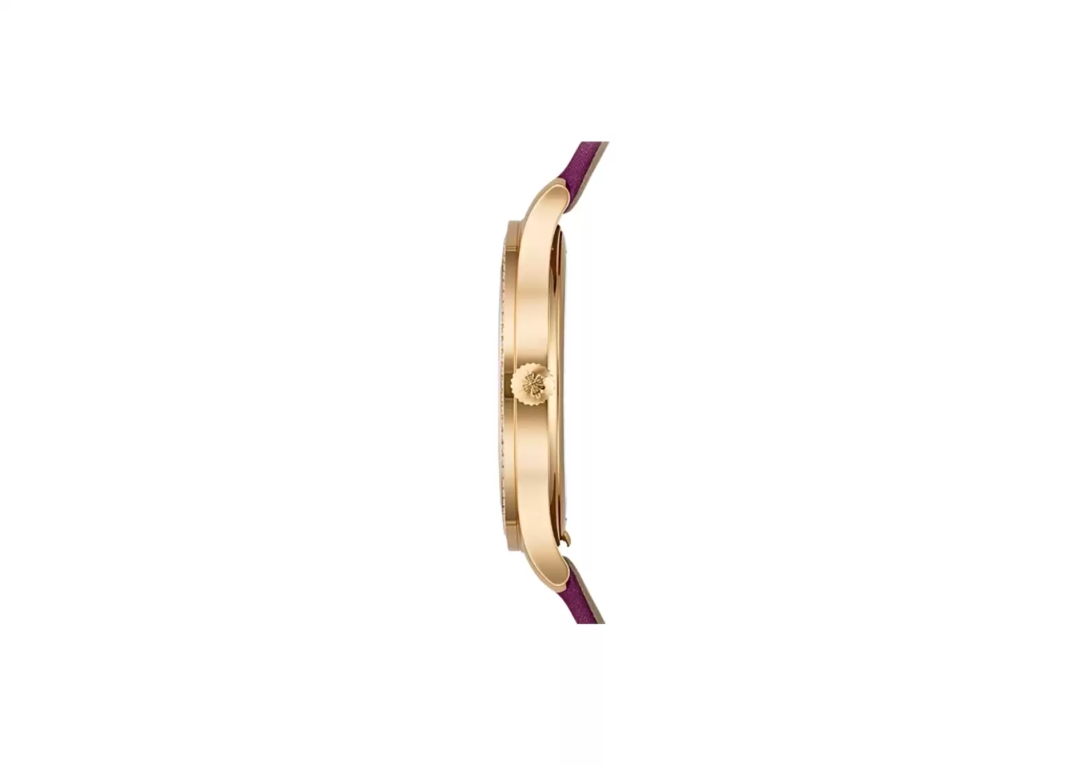The dial of this timepiece features an embossed concentric waves pattern, creating a mesmerizing depth effect. To enhance its allure, the dial is coated with over fifty layers of translucent lacquer, adding a touch of sophistication. The captivating shade of the dial is beautifully mirrored by the purple calfskin strap, boasting a satinated finish and a rose gold prong buckle.
