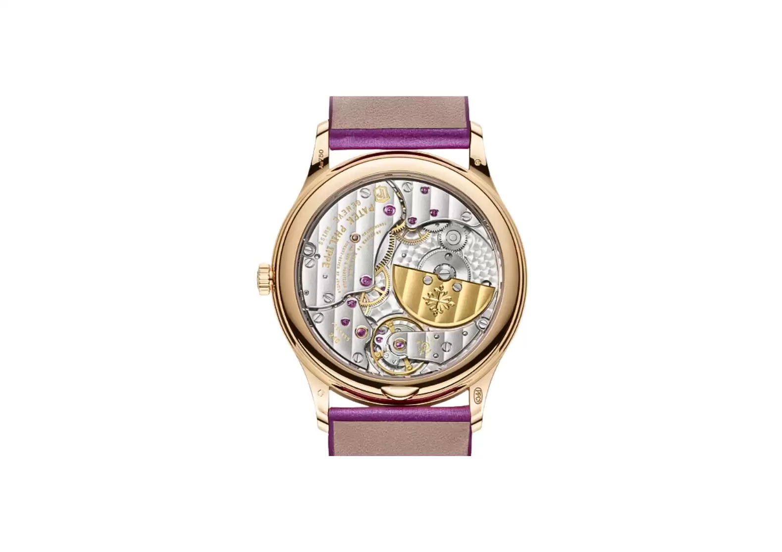 Completing the ensemble is the purple calfskin strap, featuring a satinated finish that adds a luxurious touch. Secured with a rose gold prong buckle, the strap ensures both style and comfort.