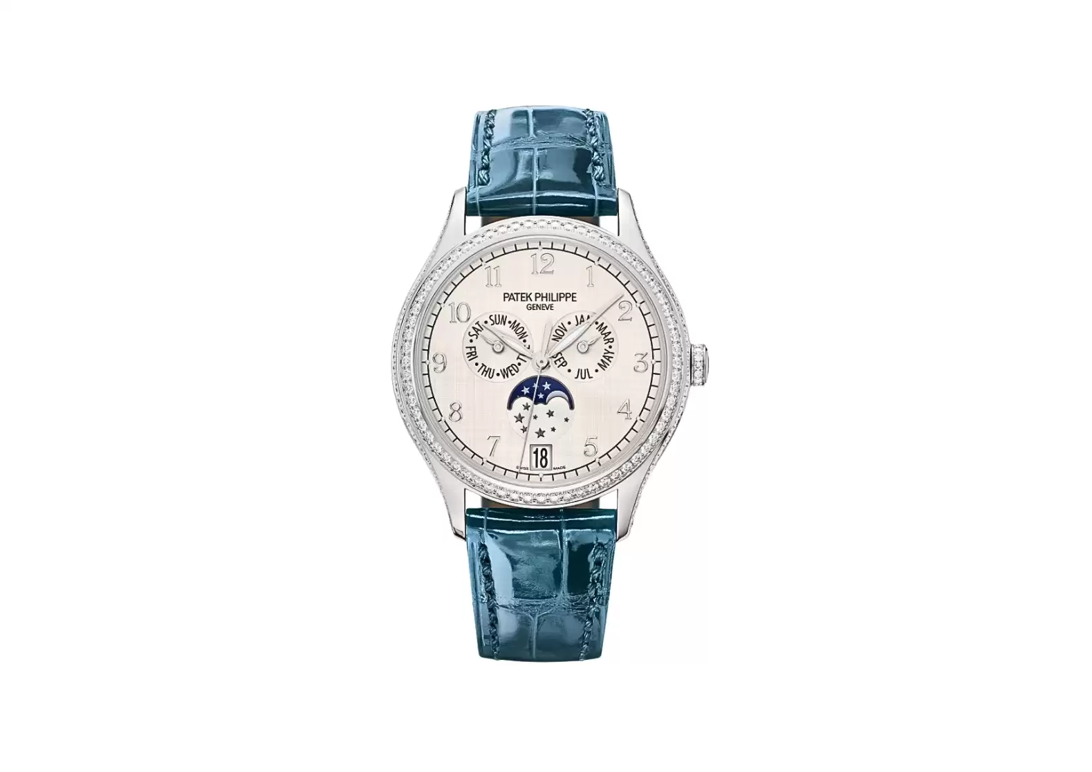 Introducing the Pre-owned Patek Philippe 4947G-010, a stunning timepiece designed exclusively for women. Crafted in white gold, this exquisite watch showcases a silvery dial with a unique double vertical and horizontal satin finish, reminiscent of the luxurious shantung silk. This intricate detailing adds a touch of feminine finesse to the patented full calendar feature, which only requires correction once a year.