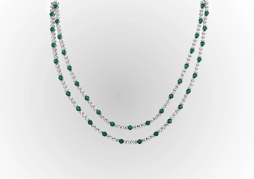 This elegant two-row tennis-style necklace is made of 18ct white gold and has brilliant cut diamonds and round green emeralds alternately claw set in illusion settings that catch the light beautifully. A modern and trendy necklace to give some glimmer to any ensemble. It would be a lovely addition to your personal jewelry collection or a magnificent present for someone special.