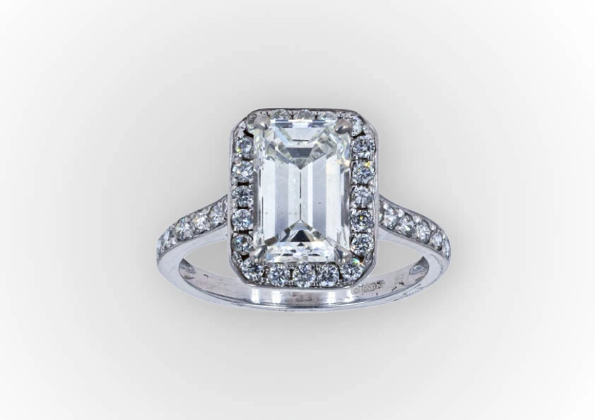 An emerald cut diamond in the center of this gorgeous 18 ct white gold ring is surrounded by glittering brilliant cut diamonds, which together weigh about 3.00 cts. A timeless classic to wear for many years to come, this exquisite ring features more diamonds that fall over the shoulders.