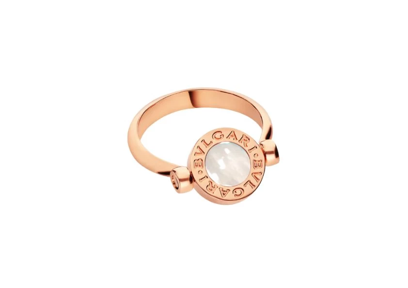 Inspired by the curved inscriptions found on ancient coins, the iconic double logo of BVLGARI BVLGARI has evolved into a playful interpretation, showcasing the brand's innovative spirit. Adorned with stunning mother-of-pearl and carnelian elements, this ring exudes a vibrant and effervescent charm.