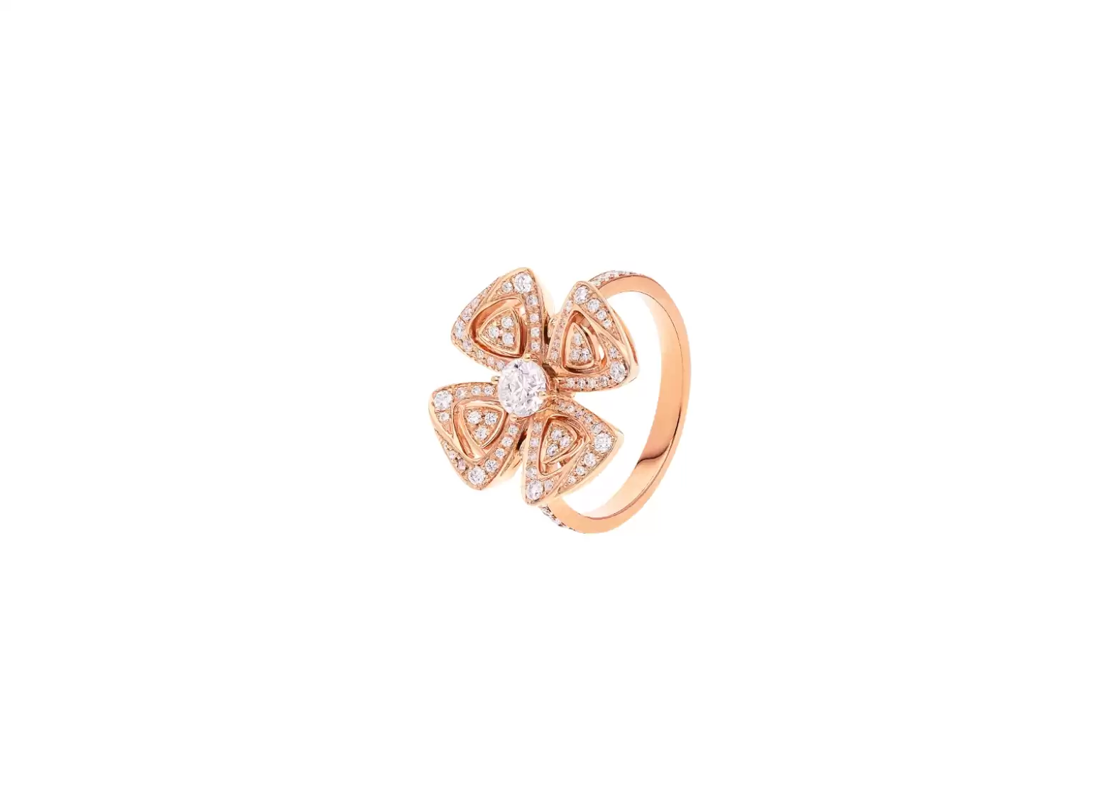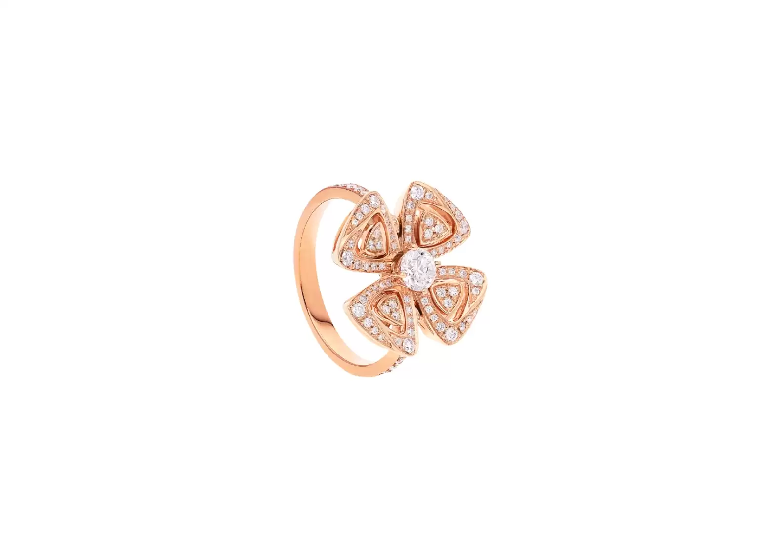 Introducing Preloved:Fiorever, a captivating 18 kt rose gold ring that will leave you breathless. This exquisite piece is set with a central diamond and pavé diamonds, creating a mesmerizing display of elegance and sophistication. Inspired by the enchanting allure of the Eternal City, Fiorever blossoms amidst the wonders of Rome. Drawing inspiration from the cherished four-petal flower, adored by the Romans as a symbol of pure happiness and boundless joy, this ring captures the essence of love and life. The name Fiorever beautifully combines two meaningful words - Fiore, the Italian word for flower, and forever, symbolizing eternal love and devotion. With its striking and passionate design, this ring pays homage to the Roman love for life, making it a truly special piece. Reimagining the multifaceted beauty of nature, Bvlgari has crafted a precious floral icon that sparkles endlessly. Four rose gold and diamond petals delicately embrace a central diamond, creating a breathtaking symphony of light and beauty. Each diamond is meticulously chosen to ensure unparalleled brilliance and radiance. Crafted with utmost precision and attention to detail, this Fiorever ring is made from 18 kt rose gold, adding a touch of warmth and femininity to its already captivating design. The pavé diamonds further enhance its allure, creating a dazzling display that will leave everyone in awe. Indulge in the timeless beauty of Preloved:Fiorever, a ring that embodies the essence of love, happiness, and everlasting joy. Whether it's a special occasion or a meaningful gesture, this ring is the perfect symbol of your affection and devotion. Experience the magic of Fiorever and let its eternal beauty adorn your finger. With its exquisite craftsmanship and captivating design, this ring is a true testament to your unique style and impeccable taste. Embrace the Roman love for life and cherish the joy it brings with Preloved:Fiorever.