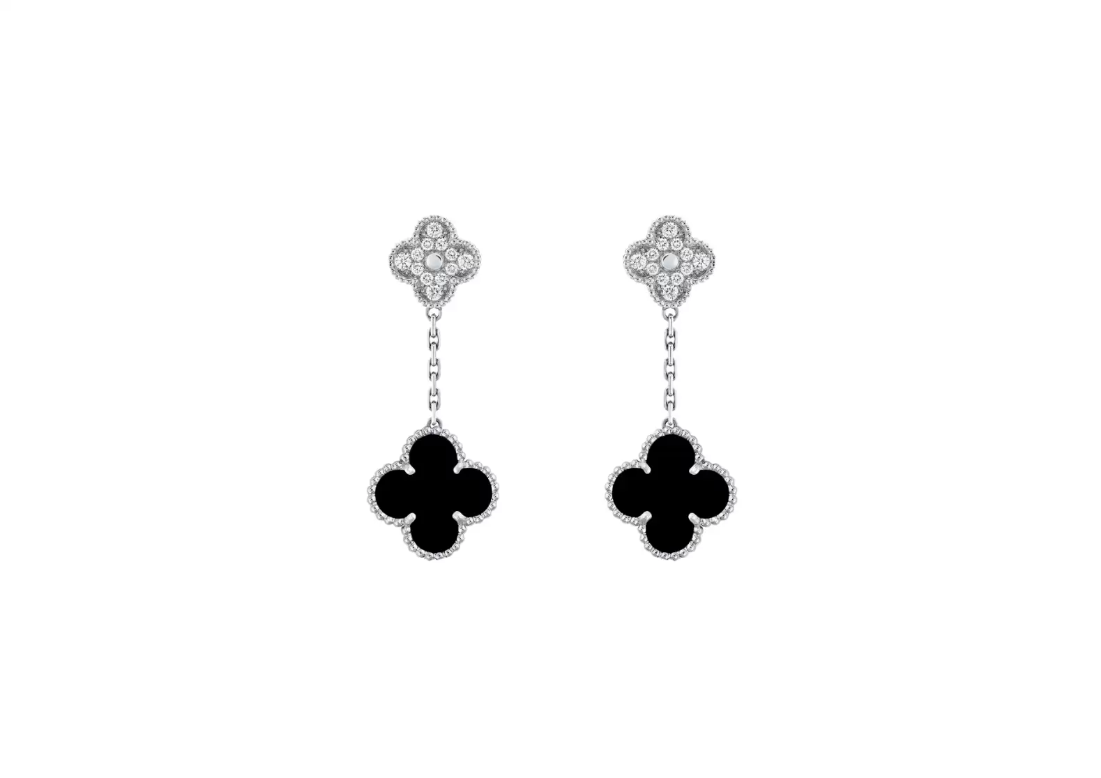 Introducing the exquisite Preloved: Magic Alhambra earrings by Van Cleef & Arpels. These stunning earrings feature two motifs crafted from rhodium plated 18K white gold, adorned with onyx and round diamonds. The diamonds are of the highest quality, ranging from DEF to IF to VVS, ensuring a brilliant sparkle that will captivate all who behold them.