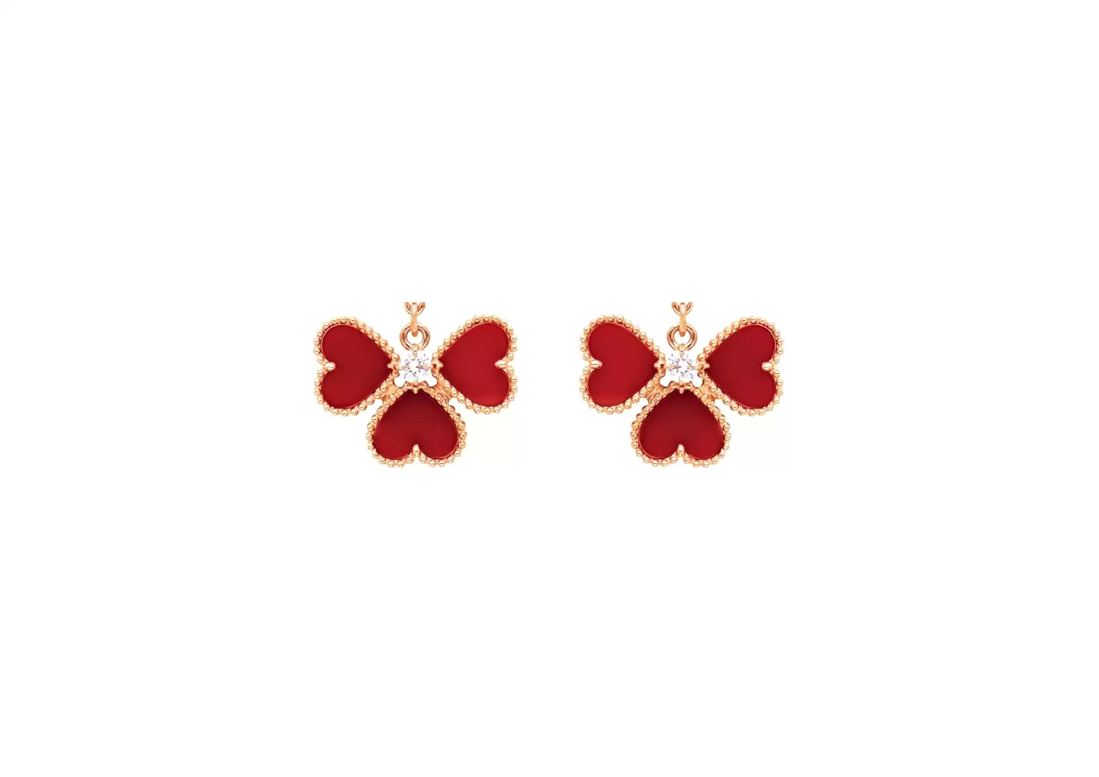 Introducing the exquisite Preloved: Sweet Alhambra Effeuillage Earrings by Van Cleef & Arpels. Crafted in 18K rose gold, these stunning earrings feature the captivating beauty of carnelian and round diamonds. The vibrant carnelian stones, totaling 8 in number, add a touch of warmth and elegance to these earrings. Each carnelian stone is unique, ensuring that every creation is one-of-a-kind, with variations in color and features. Enhancing the allure of these earrings are two dazzling round diamonds, totaling 0.17 carats. The diamonds boast an exceptional quality, ranging from DEF to IF to VVS, ensuring a brilliant sparkle that will catch everyone's attention. With their delicate effeuillage design and the harmonious combination of carnelian and diamonds, these earrings are a true testament to Van Cleef & Arpels' craftsmanship and attention to detail. Indulge in the timeless beauty of the Preloved: Sweet Alhambra Effeuillage Earrings and elevate your style with a touch of sophistication.