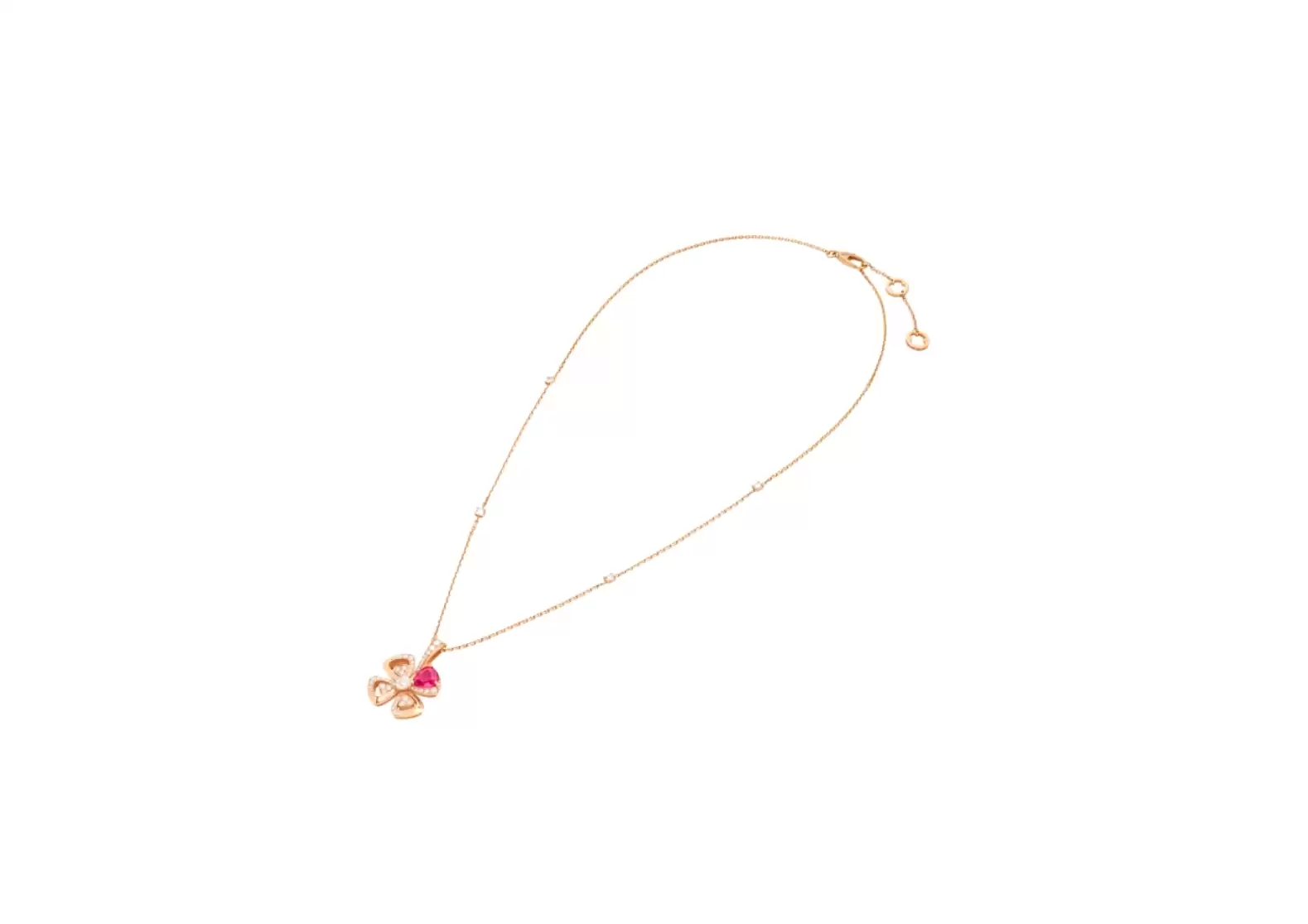 Indulge in the allure of the Fiorever 18 kt rose gold pendant necklace set with a brilliant-cut diamond, a fancy-cut rubellite, and pavé diamonds. Experience the joy of wearing a piece that not only complements your style but also celebrates the beauty of nature and the artistry of Bulgari.