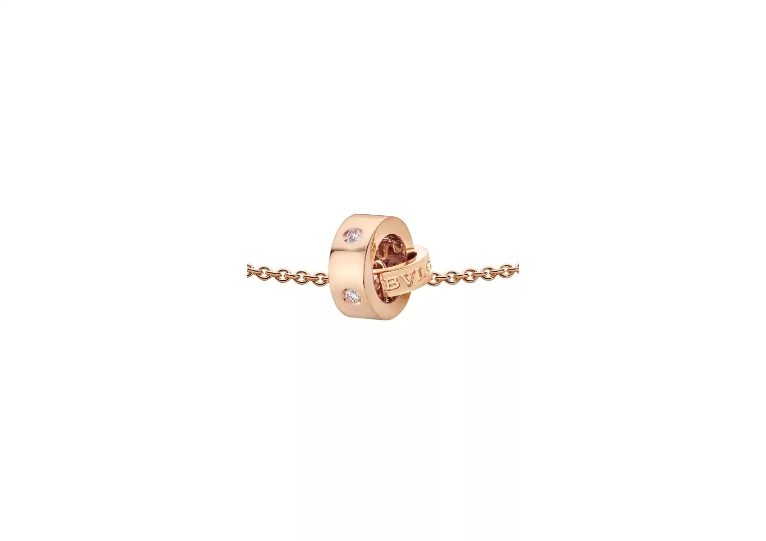 Inspired by the curved inscriptions found on ancient coins, the trademark double logo of Bvlgari has been beautifully reimagined to offer a playful and unexpected touch to the design. It is a symbol of the brand's rich history and commitment to innovation. The necklace features a delicate 18 kt rose gold chain that gracefully adorns the neck, exuding a sense of timeless beauty. The pendant, also crafted in 18 kt rose gold, is set with five dazzling diamonds, adding a touch of sparkle and luxury.