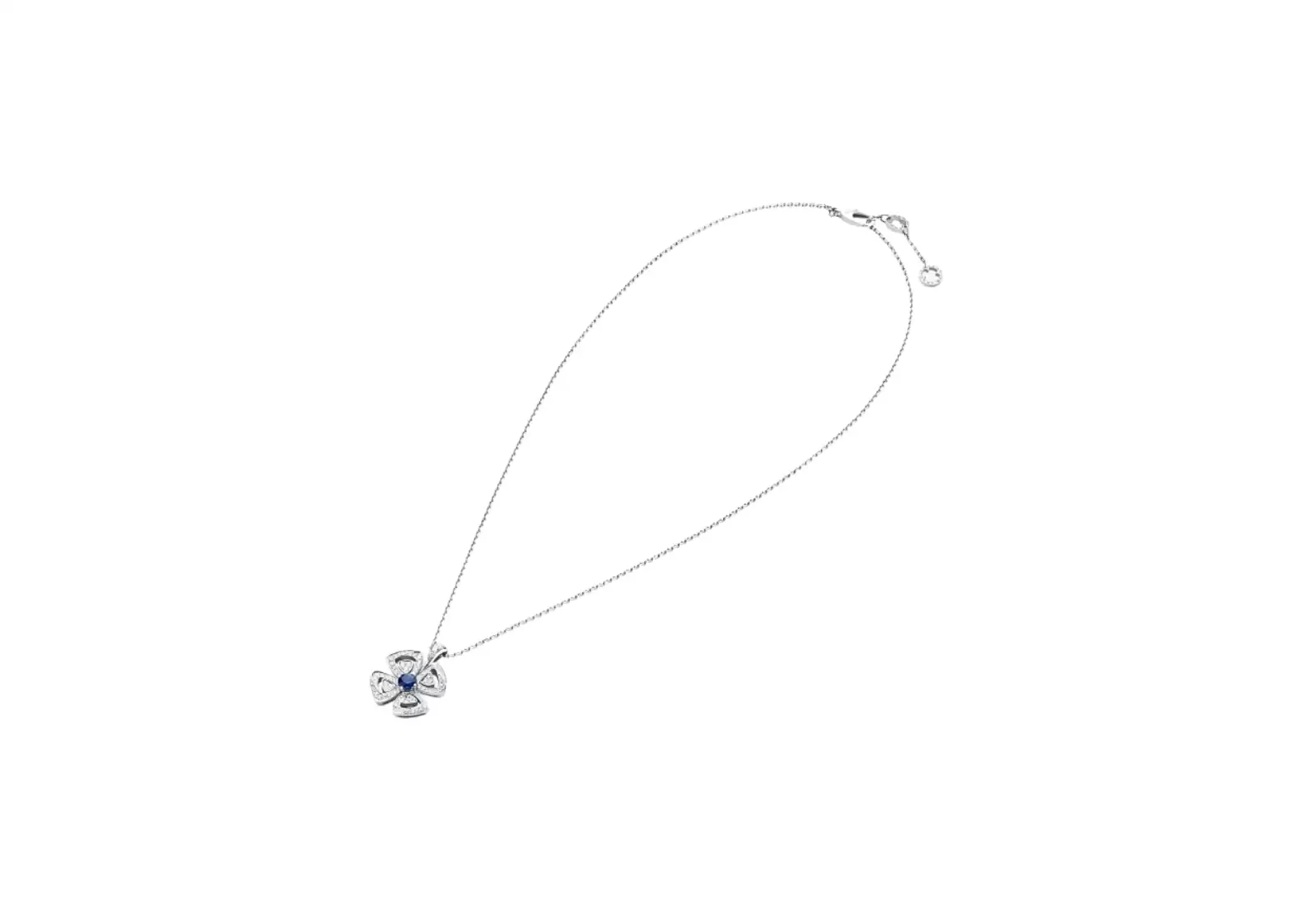 Crafted with Bvlgari's unparalleled attention to detail, this pendant necklace is a testament to our commitment to sourcing only the most exquisite, rare, and vibrant gems. The central brilliant-cut sapphire, with its mesmerizing hue, takes center stage and adds a precious splash of color to this already stunning piece.