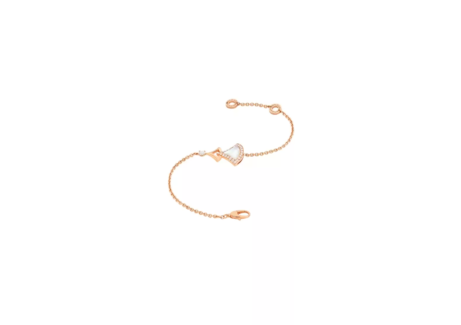 Inspired by the essence of feminine elegance, the DIVAS' DREAM bracelet showcases the collection's iconic fan-shaped motif, expertly crafted with an intricate openwork element. Adding a touch of ethereal beauty, a stunning mother-of-pearl insert takes center stage, delicately framed by dazzling pavé diamonds. This combination creates an unmistakable signature, reminiscent of the sensual patterns found in Rome's majestic Caracalla mosaics.