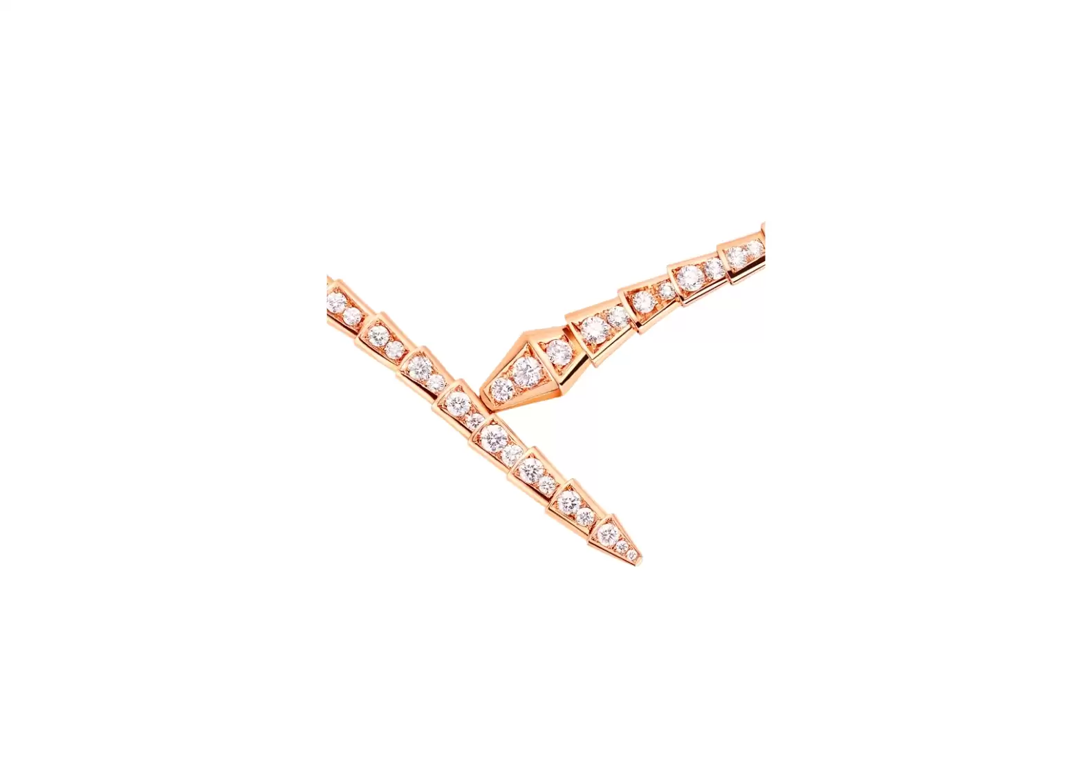 Introducing the Serpenti Viper 18 kt rose gold necklace set with pavé diamonds - a mesmerizing masterpiece that embodies Bulgari's timeless symbol of metamorphosis and unstoppable transformation. Prepare to be captivated by its ultra-modern interpretation and sleek sensuality. Crafted with meticulous attention to detail, each individual scale of this necklace is adorned with dazzling pavé diamonds. The result is an exquisite blend of geometric flair, refined sinuosity, and irresistible brilliance that will leave you breathless. Indulge in the allure of this elegant accessory, designed to make a bold statement wherever you go. The Serpenti Viper necklace is a true testament to Bulgari's unrivaled craftsmanship and commitment to creating pieces that exude luxury and sophistication. Elevate your style and embrace the hypnotic charm of this 18 kt rose gold necklace. Whether it's a special occasion or a night out on the town, this iconic piece is guaranteed to turn heads and leave a lasting impression. Experience the allure of the Serpenti Viper necklace - a true symbol of elegance and timeless beauty. Don't miss the opportunity to own a piece of Bulgari's legacy and showcase your impeccable taste with this stunning accessory.