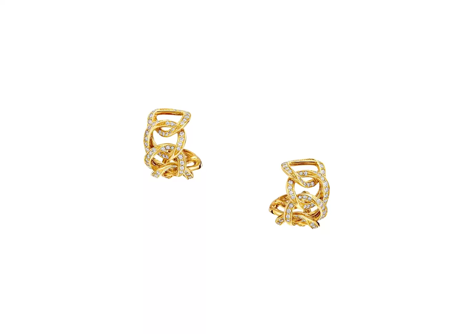 Crafted in yellow gold, these earrings feature a swirling design that elegantly loops around the ear, creating a captivating and unique look. Each pavé stone is meticulously positioned by hand, showcasing the absolute precision and attention to detail that goes into creating these stunning pieces.