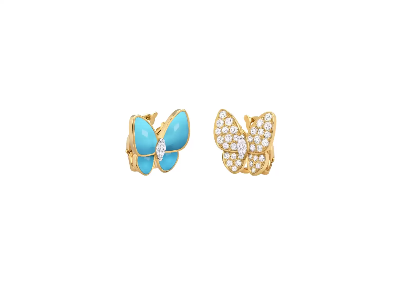 Introducing the Preloved Two Butterfly Earrings, a stunning piece crafted with exquisite attention to detail. Made from 18K yellow gold, these earrings exude a luxurious charm that will captivate any onlooker. The focal point of these earrings is the mesmerizing turquoise stones, which add a vibrant pop of color to the design. With four turquoise stones delicately placed, each earring showcases the natural beauty of this captivating gemstone. To enhance the elegance of these earrings, round diamonds are meticulously set in rhodium plated 18K white gold. The brilliance of these diamonds adds a touch of sparkle and sophistication to the overall design. With a total of 36 diamonds weighing 1.0 carat, these earrings are a true testament to the beauty of nature's most precious gem. The diamond quality of these earrings is exceptional, ranging from DEF, IF to VVS. This ensures that each diamond possesses a flawless clarity and radiates a dazzling brilliance that will leave you in awe. The marquise-cut diamonds further enhance the uniqueness of these earrings, adding a touch of elegance and sophistication. The combination of the marquise-cut diamonds with the turquoise stones creates a harmonious balance between classic and contemporary design elements. Please note that as each stone is unique, the color and features may vary from one creation to another. This ensures that each pair of Preloved Two Butterfly Earrings is truly one-of-a-kind, making it a special and personal accessory to cherish. With its timeless beauty and exceptional craftsmanship, the Preloved Two Butterfly Earrings are a must-have addition to any jewelry collection. Whether worn for a special occasion or as an everyday accessory, these earrings are sure to make a statement and elevate any outfit.
