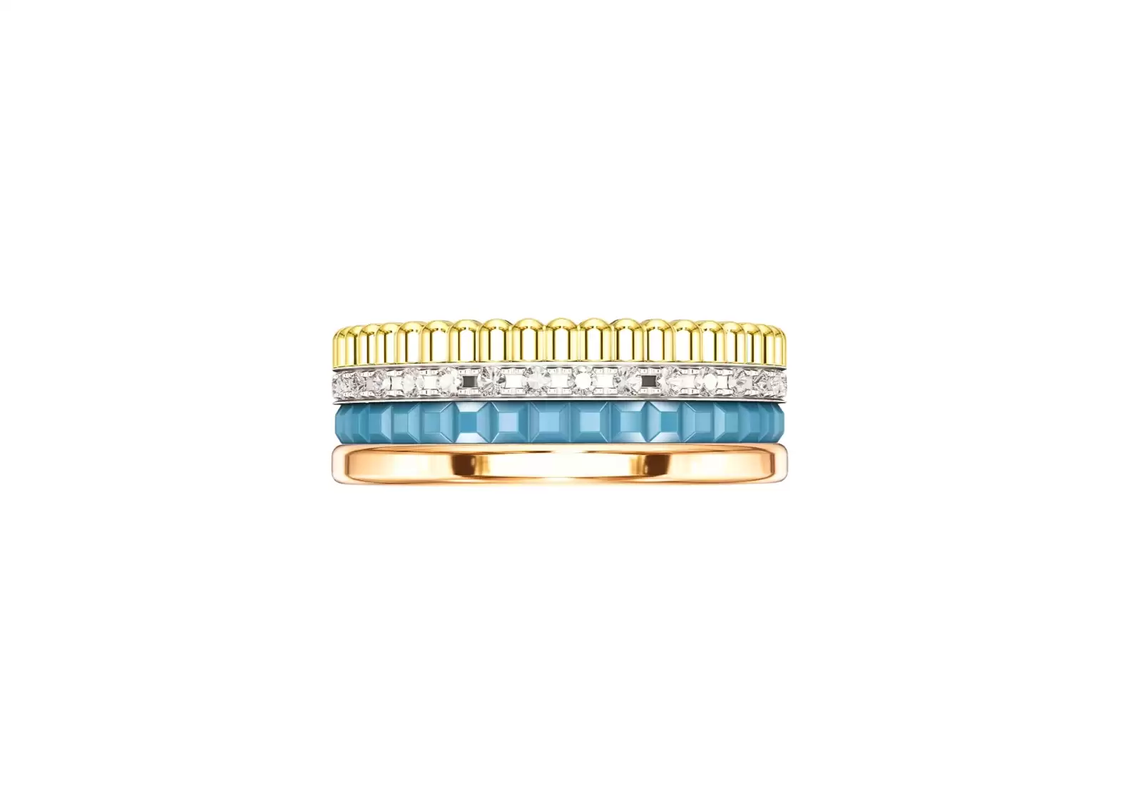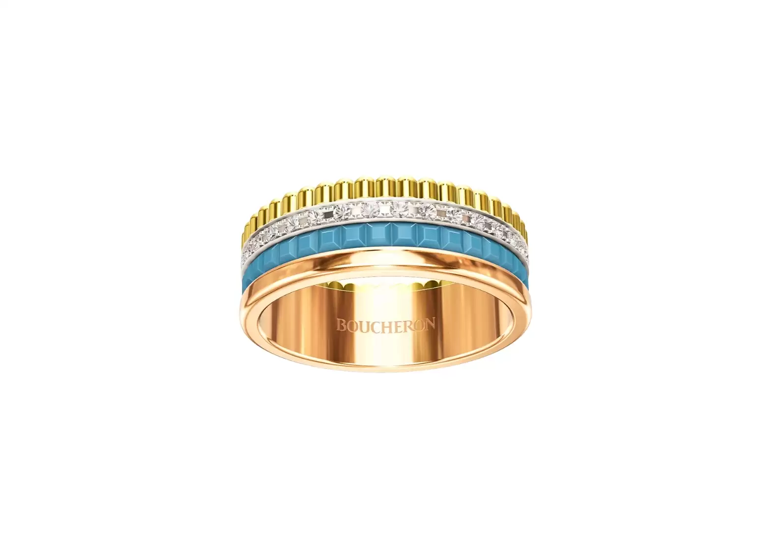 Introducing the exquisite Preloved: Quatre Blue Edition Small Ring REF JRG03028, a true masterpiece crafted with the finest materials and unparalleled attention to detail. This stunning ring is adorned with a remarkable 330.24-carat round diamonds, radiating a mesmerizing brilliance that will captivate all who lay eyes on it. Each diamond has been carefully selected for its exceptional quality, ensuring a truly luxurious and opulent piece. The band of this magnificent ring is expertly crafted from 18K yellow, pink, and white gold, adding a touch of sophistication and elegance. The combination of these three gold hues creates a harmonious and visually striking contrast, making this ring truly unique. Adding a contemporary twist to its design, the Preloved: Quatre Blue Edition Small Ring features a captivating blue ceramic element. This vibrant blue hue adds a pop of color and modern flair to the overall aesthetic, making it a perfect choice for those seeking a statement piece that stands out from the crowd. With its distinctive design and exceptional craftsmanship, this ring is a true testament to the artistry of fine jewelry. It effortlessly combines classic elegance with contemporary style, making it a versatile accessory that can be worn for any occasion. The Preloved: Quatre Blue Edition Small Ring REF JRG03028 is a true symbol of luxury and sophistication. Its timeless beauty and impeccable quality make it a treasured addition to any jewelry collection. Elevate your style and make a lasting impression with this extraordinary piece.