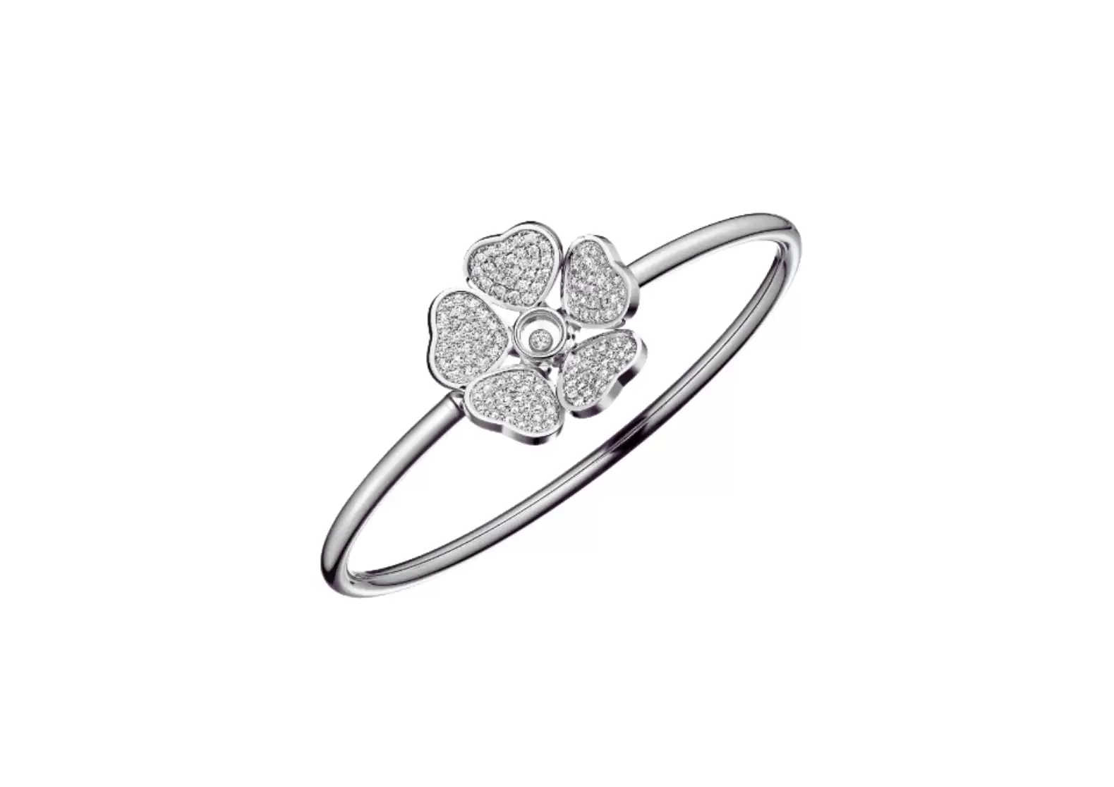 The Happy Hearts Flowers bangle is part of Chopard's moving diamond jewelry collection, where the diamonds gracefully dance and move with the wearer's every move. This unique feature adds an element of playfulness and charm to the piece, making it truly special.