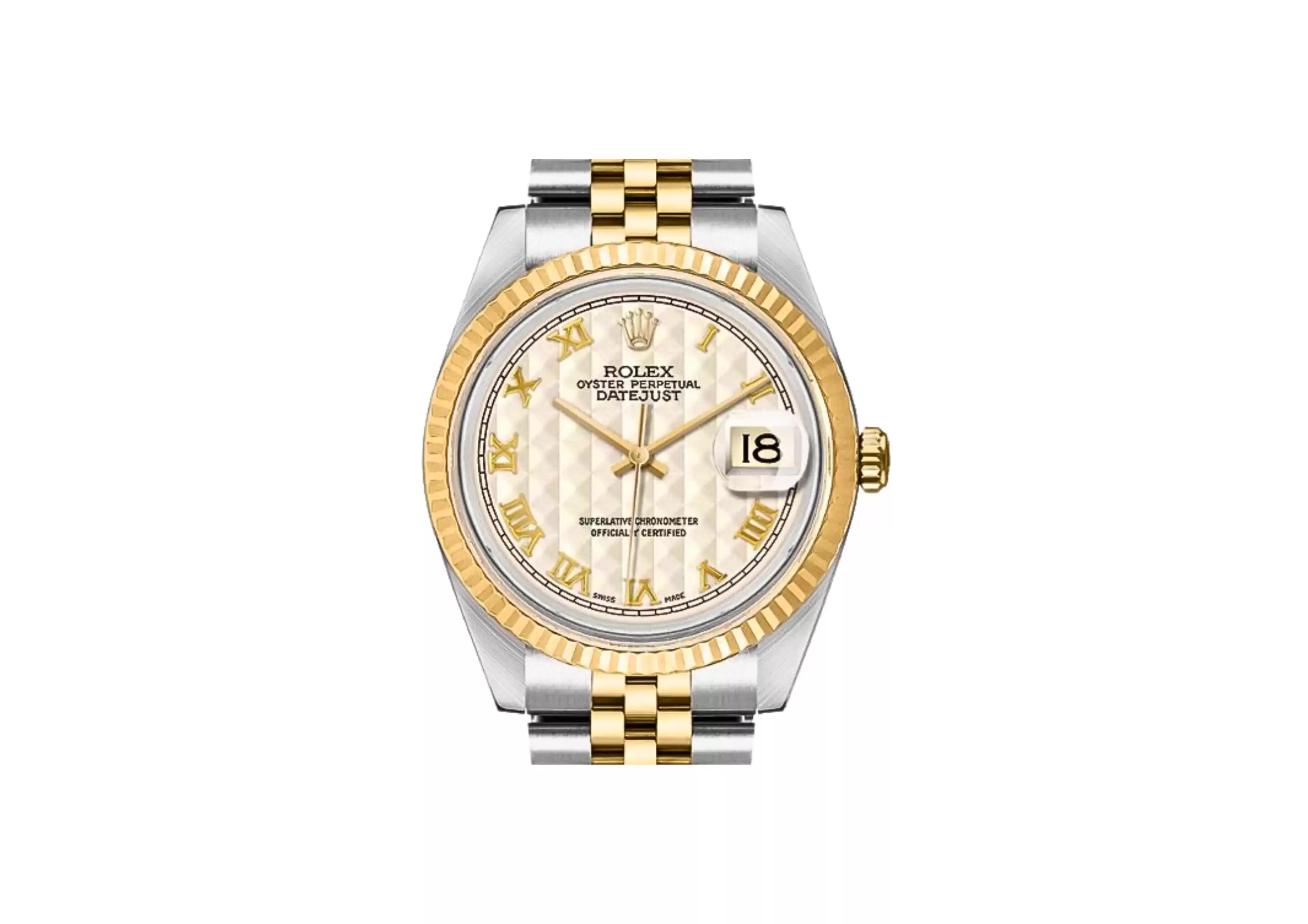 Featuring an exquisite Ivory Dial with a captivating Pyramid Pattern, this watch is a visual delight. The Roman Numeral Hour Markers add a touch of sophistication and class to its design. The Polished Solid 18k Yellow Gold Fluted Bezel further enhances its luxurious appeal.