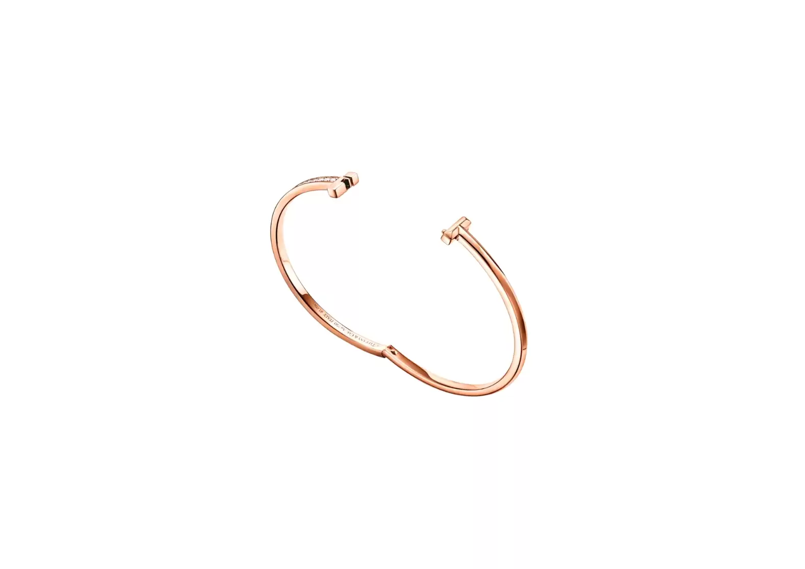Introducing the exquisite Preloved: Tiffany T T1 Hinged Bangle in Rose Gold with Diamonds, Narrow | 68315778. This stunning piece of jewelry is designed to wrap around the wearer in a continuous, unbroken circle, symbolizing eternity and everlasting beauty.