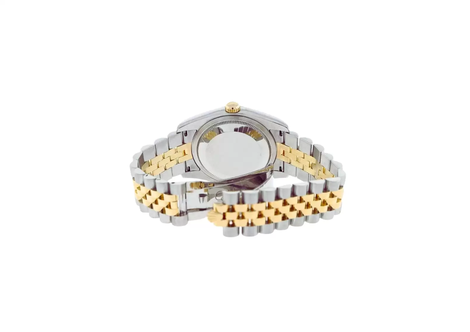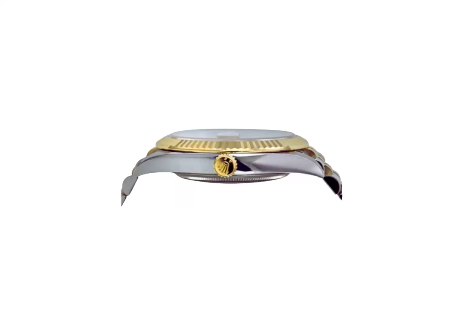 Encased in a classic stainless steel case with a 36mm diameter and an 18k yellow gold fluted bezel, this watch effortlessly blends luxury and durability. The two-tone jubilee bracelet and concealed folding crownclasp ensure a comfortable fit, allowing you to wear it all day long without any discomfort.