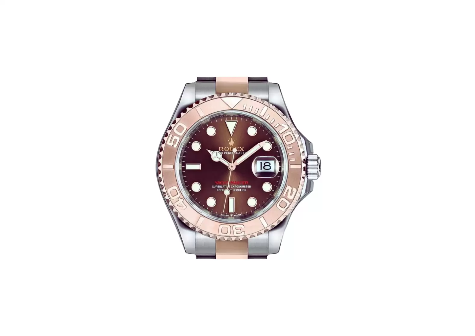 Introducing the Pre-owned Rolex Yacht-Master 40 18k Everose Gold & Steel Men's Watch 126621-0001. This remarkable timepiece showcases a captivating chocolate dial adorned with dot and index hour markers, accompanied by a convenient date window positioned at the 3 o'clock mark. Encircling the dial is an elegant 18k rose gold bezel, adding a touch of opulence to its overall design.