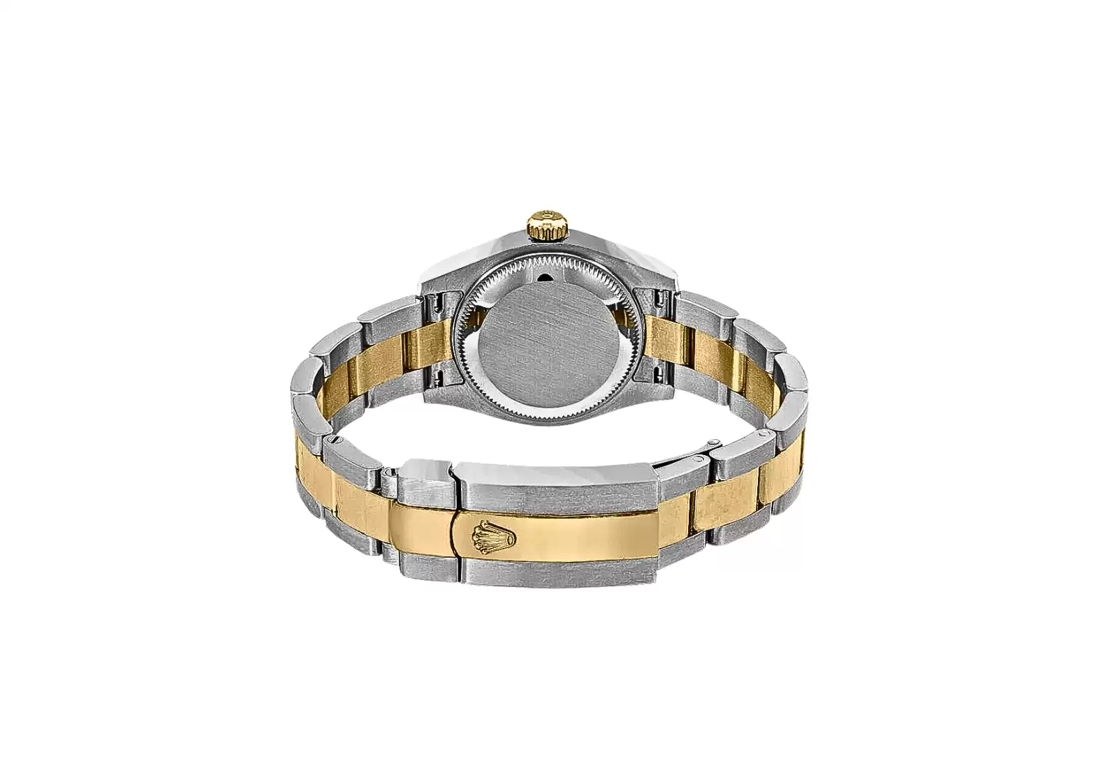 The polished 904L Oystersteel stainless steel case and brushed 904L Oystersteel stainless steel with polished solid 18k yellow gold Oyster bracelet create a harmonious blend of durability and elegance. The scratch-resistant sapphire crystal protects the dial from any accidental damage, while the 100 meters waterproof rating ensures its reliability in various environments.
