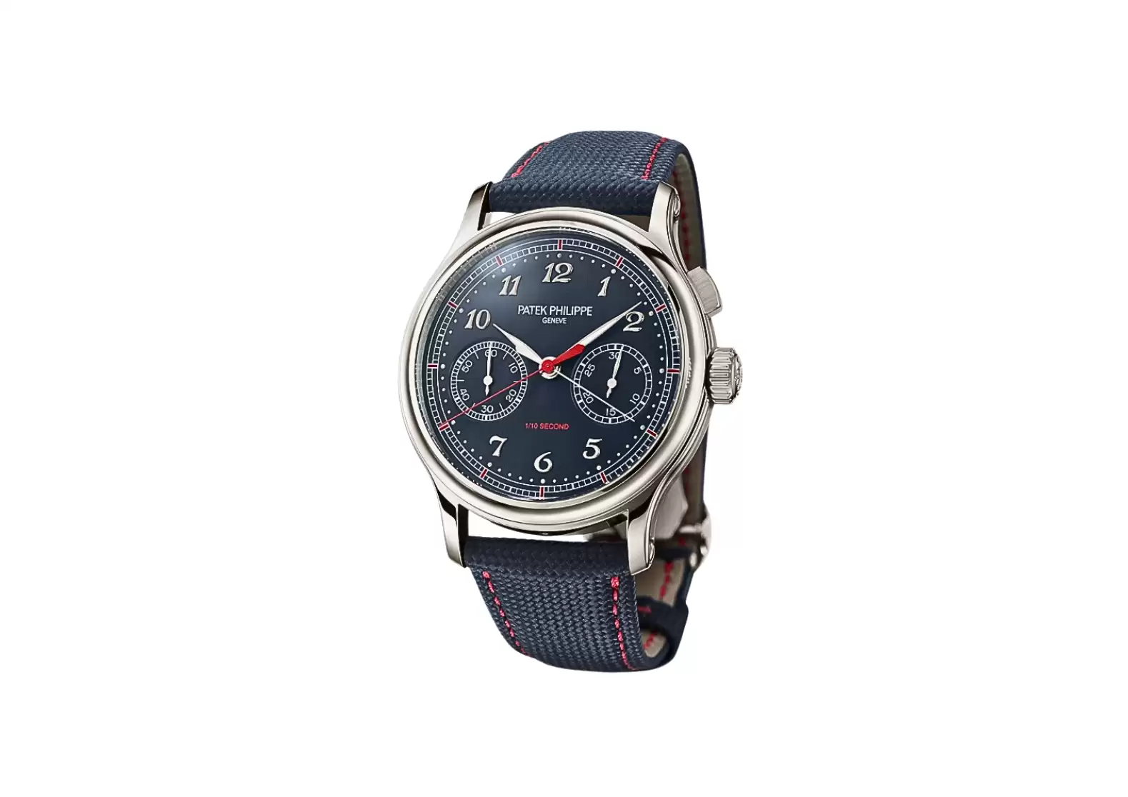 Completing the ensemble is a calfskin strap, embossed with a fabric pattern and hand-stitched in a captivating navy blue hue. The fold-over clasp ensures a secure and comfortable fit, allowing you to wear this exceptional timepiece with confidence.