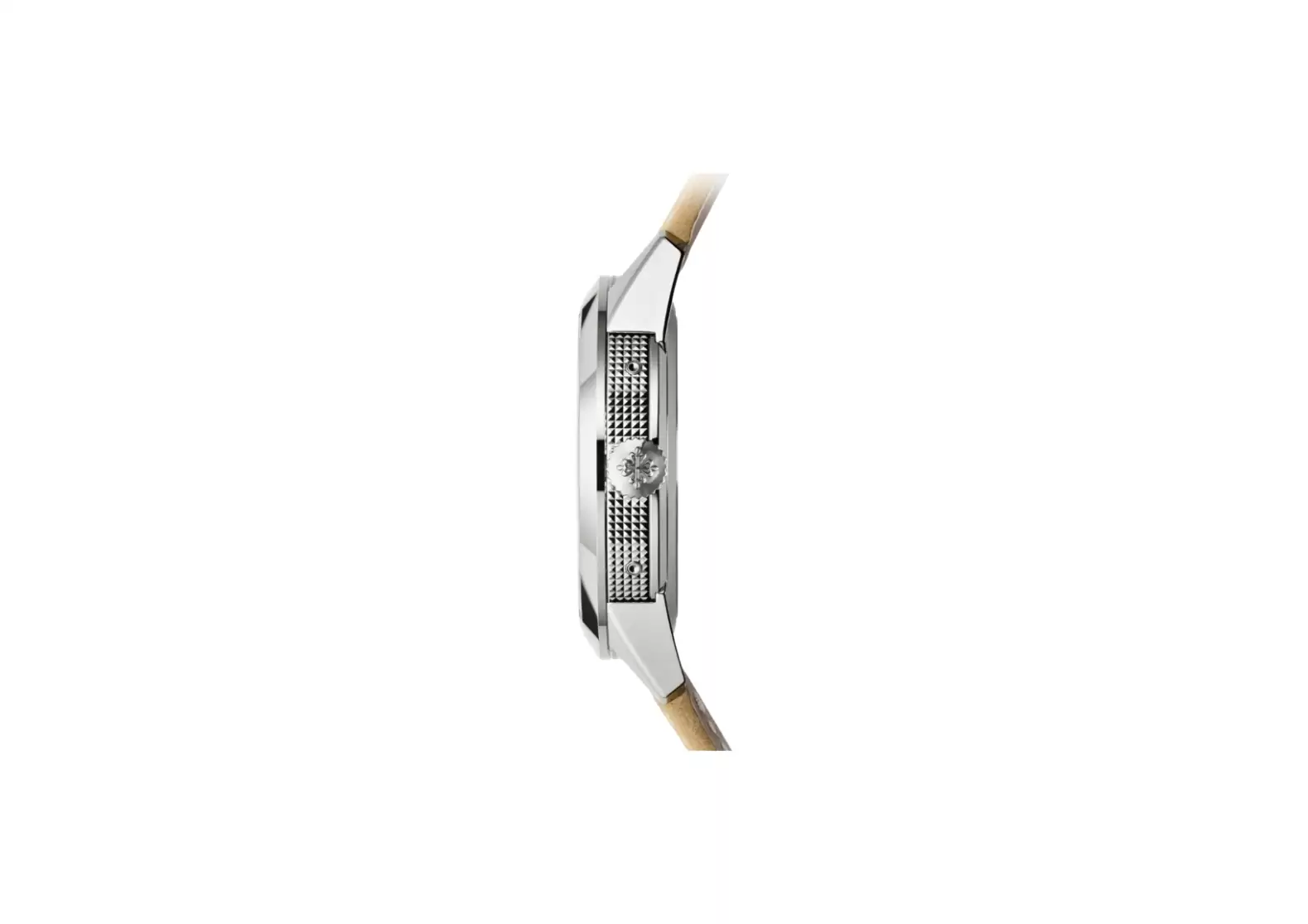 This exceptional timepiece is accompanied by two interchangeable straps, providing versatility to match any occasion. The first strap is crafted from beige calfskin with a nubuck finish, exuding a sense of sophistication. The second strap, made from black calfskin, features an embossed fabric motif with beige topstitching, adding a touch of uniqueness to the watch.