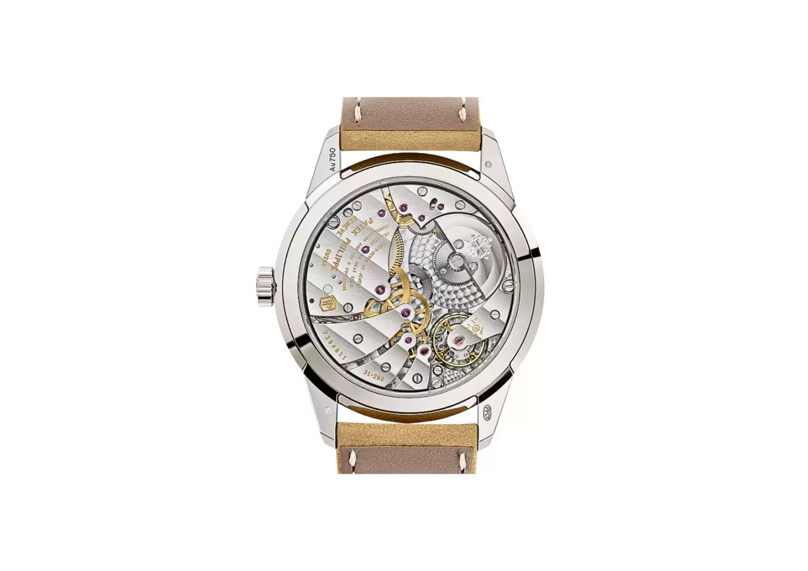 The Pre-owned Patek Philippe 5326G-001 is completed with a calfskin strap in a nubuck finish, hand-stitched in a beautiful beige color. This strap perfectly complements the watch's overall aesthetic. Additionally, an additional strap is included, crafted from black calfskin and embossed with a fabric pattern. The hand-stitched strap features beige topstitching, adding a touch of contrast and style. The fold-over clasp ensures a secure and comfortable fit.