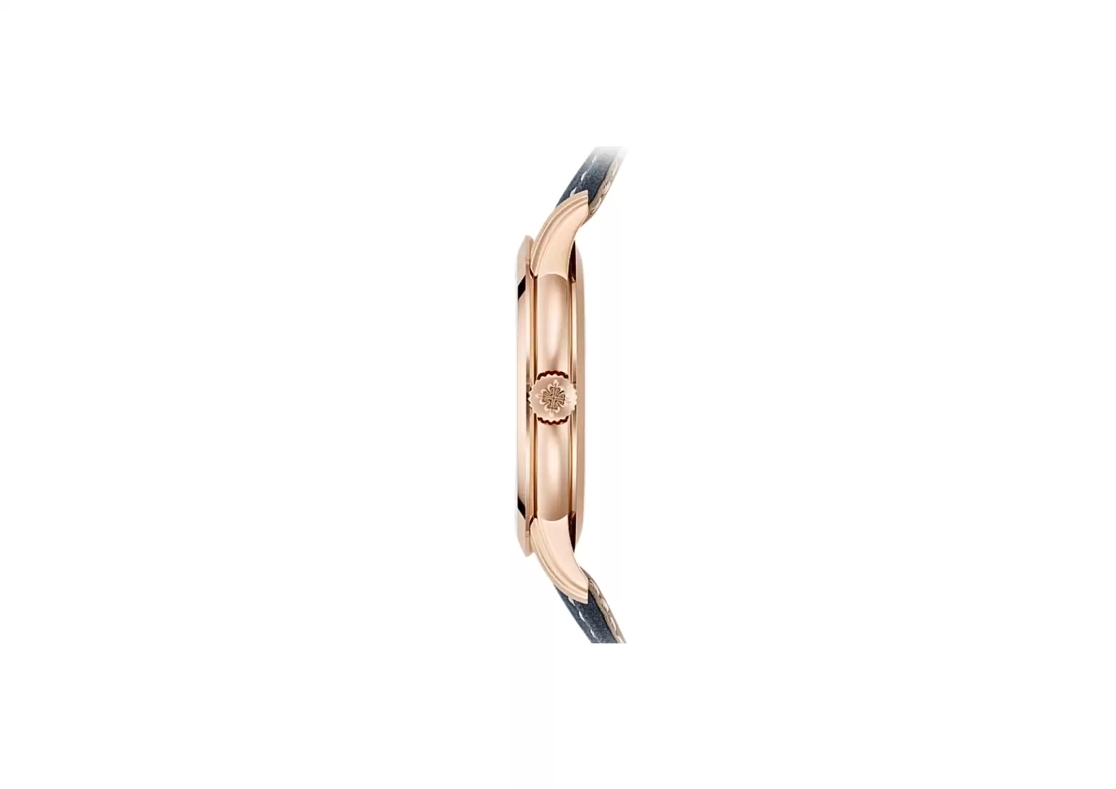 The navy blue dial, adorned with hand-laid rose gold appliques, exudes a sense of refinement. The contrasting finishes on the dial enhance its visual appeal, making it a true standout in any setting.