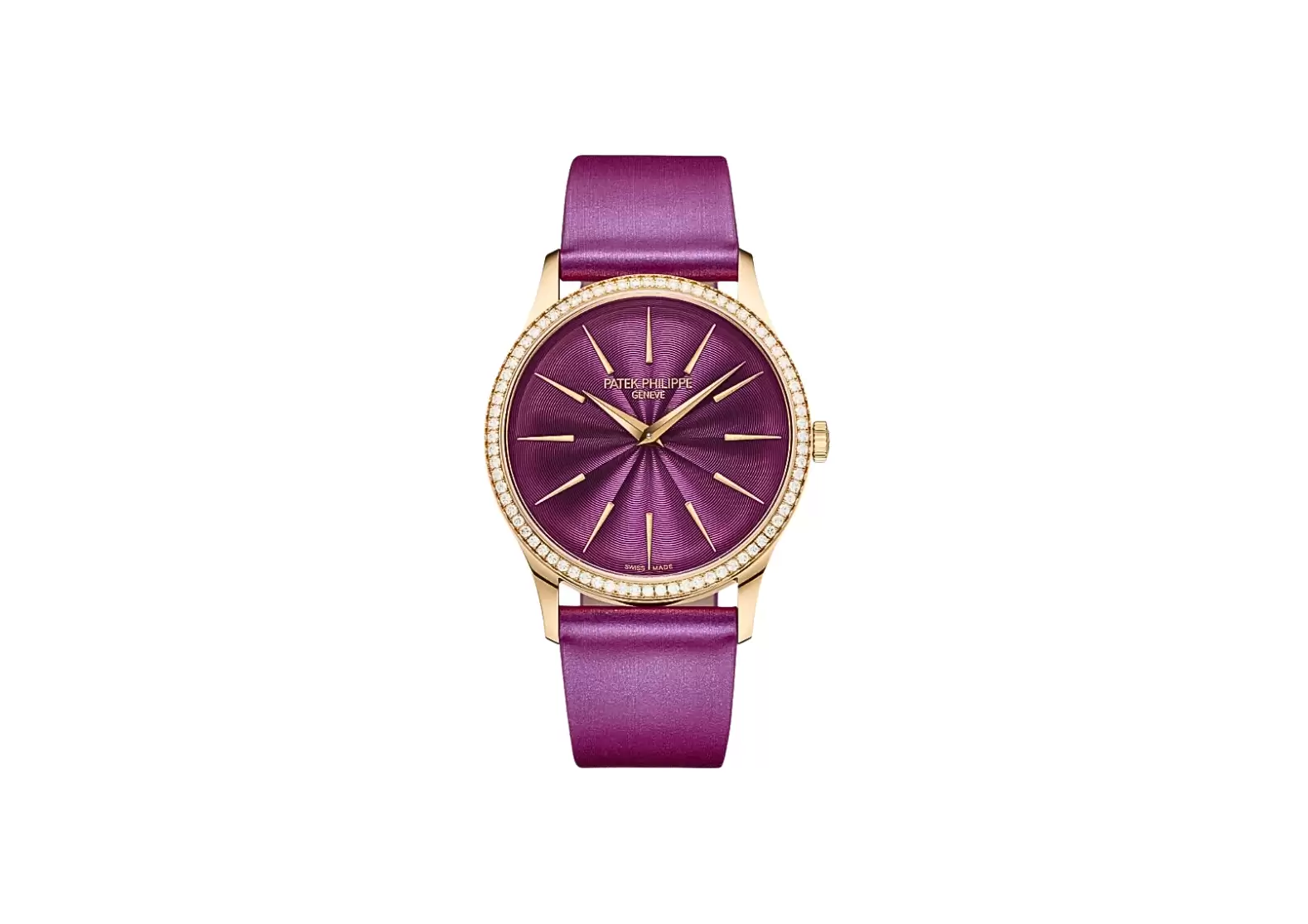 Introducing the Pre-owned Patek Philippe 4997/200R-001, a stunning addition to Patek Philippe's collection of elegant ladies' watches. This timepiece showcases a new version of the self-winding Calatrava Reference 4997, crafted in luxurious rose gold and adorned with a captivating purple hue. The unique color choice harmoniously complements the warm tones of the precious metal and the diamond-set bezel, resulting in a truly refined and original design.