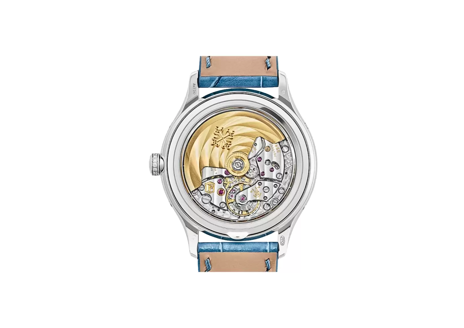 The dial of the Patek Philippe 4947G-010 features gold applied numerals, beautifully contrasting against the silvery backdrop. Encased in white gold, this timepiece exudes a timeless elegance. The sapphire crystal case back not only adds a touch of sophistication but also provides a glimpse into the intricate inner workings of the watch. With a water resistance of up to 30 meters, this timepiece is suitable for everyday wear.