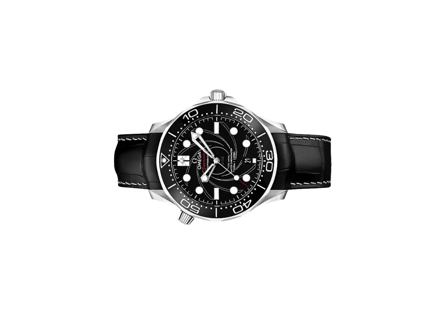 The polished with brushed platinum case and black leather strap with a pattern exude timeless elegance. The domed scratch-resistant sapphire crystal with anti-reflective treatment on both sides ensures optimal visibility. With a water resistance of 300 meters (1000 feet), this watch is suitable for both professional diving and everyday wear.