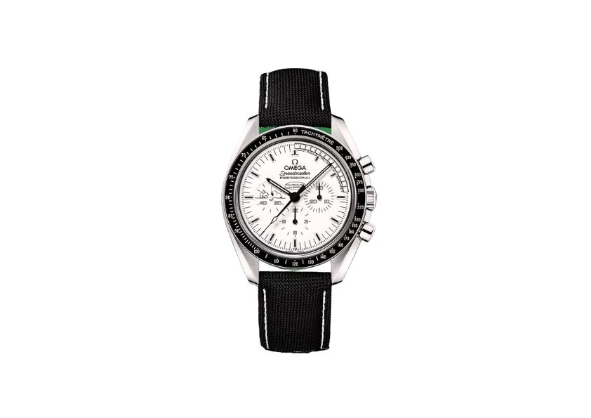 The design of this Moonwatch has been refreshed with a stunning white dial, adorned with a Super-LumiNova Snoopy on the 9 o'clock subdial. The dial proudly displays the iconic phrase "Failure is not an option" and poses the thought-provoking question, "What could you do in 14 seconds?" with 14 squares representing the beloved Snoopy comics. Crafted with meticulous attention to detail, the 42.00 mm polished-brushed case is made from stainless steel, exuding a timeless elegance. The polished black ceramic bezel ring, featuring Super-LumiNova on the tachymeter scale, adds a touch of sophistication to this exceptional timepiece. True to its heritage, this watch is powered by the renowned OMEGA Calibre 1861, ensuring precise and reliable timekeeping. The "Moonwatch" style hands pay homage to the original design, evoking a sense of nostalgia and authenticity. Completing the ensemble is a black coated nylon fabric strap, exuding a sense of ruggedness and durability. And as a symbol of distinction, each watch is accompanied by a meticulously crafted 925 Silver Snoopy medallion, adorned with dark blue enamel on the reverse.