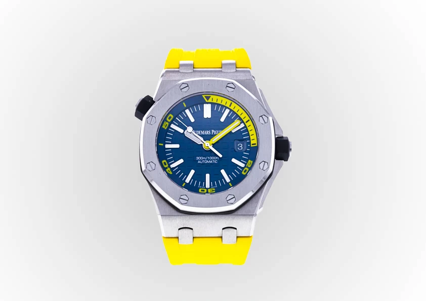 The most important idea of this offshore diver is the 42mm stainless steel case, 14.1mm thick, blue rubber-clad screw-locked crown, glareproofed sapphire crystal, blue dial with Méga Tapisserie" pattern, white gold applied hour-markers and Royal Oak hands with luminescent coating, blue rotating inner bezel with diving scale, and zone from 60 to 15 minutes in yellow.
